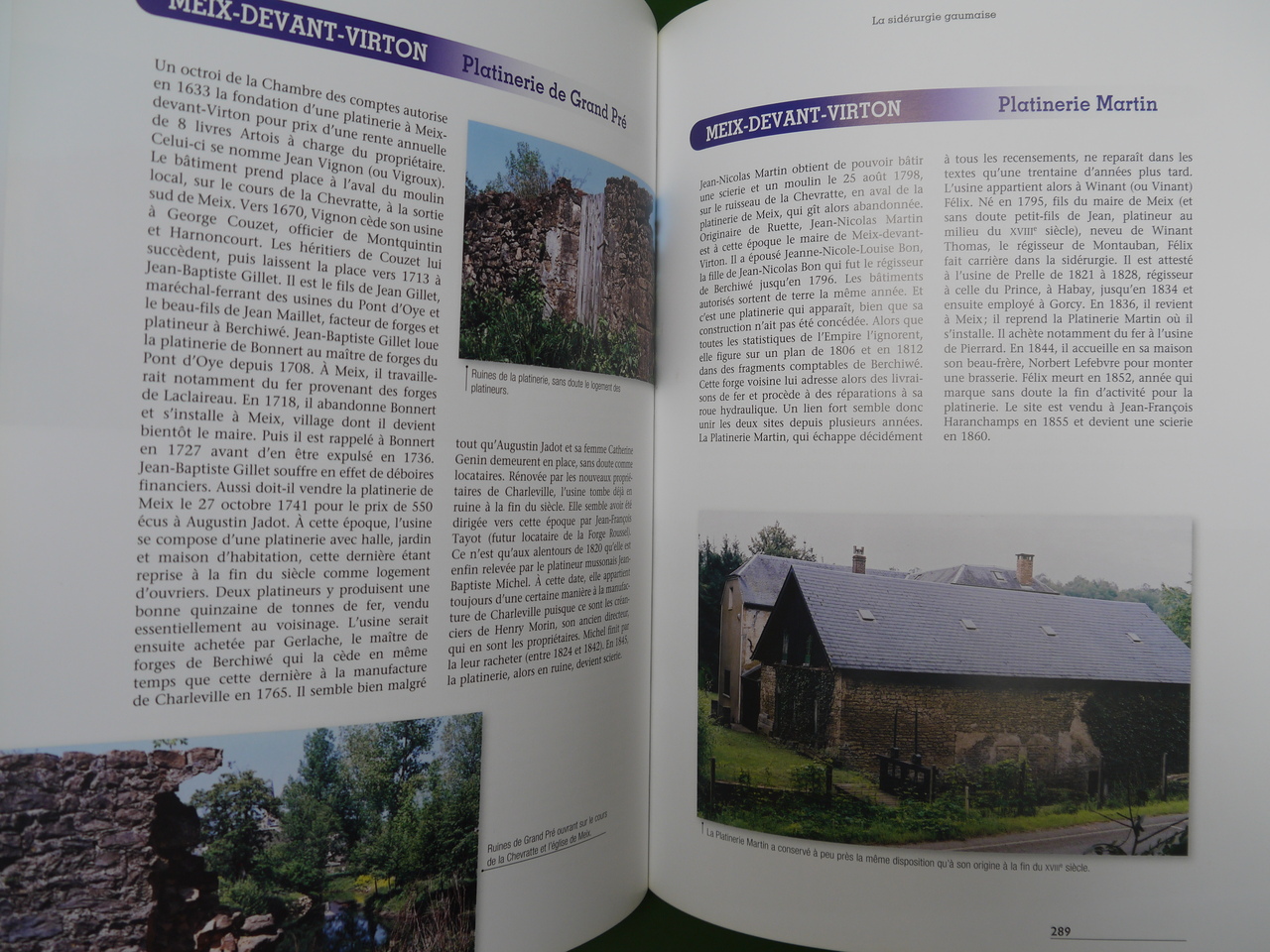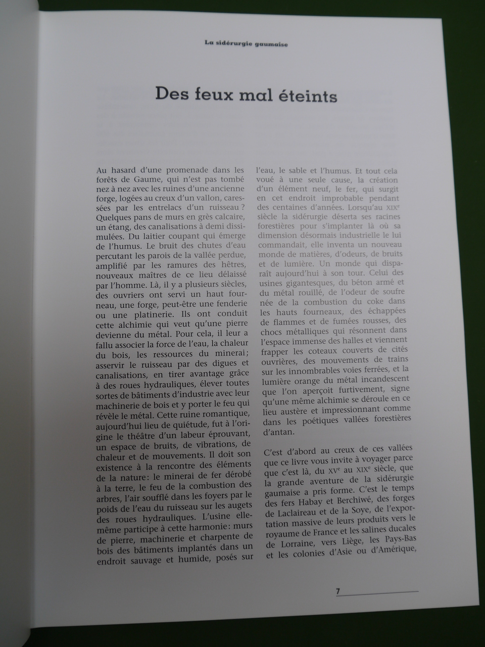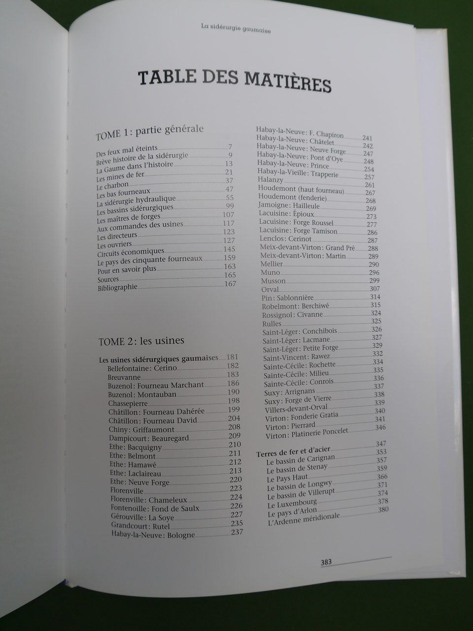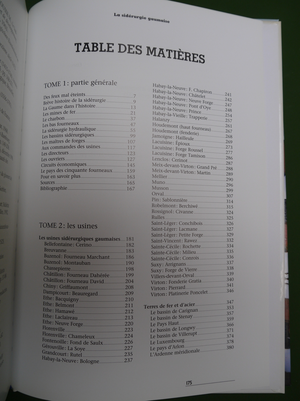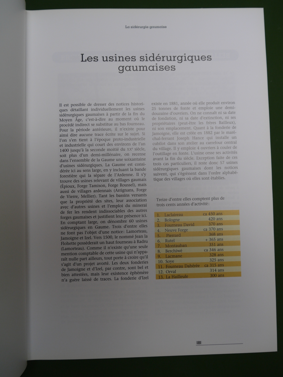 « Les deux tomes de « La sidérurgie gaumaise » embrassent au moins 2000 ans d’histoire, depuis l’époque des bas fourneaux jusqu’aux usines industrielles des XIXe et XXe siècles. La première partie détaille tous les thèmes de la sphère sidérurgique: matières premières, outillage industriel, production, personnel, maîtres de forges… La seconde passe en revue l’ensemble des usines gaumaises des 600 dernières années. À cette soixantaine de notices individuelles s’ajoutent quatre-vingts autres traitant des entreprises sidérurgiques voisines, de Villerupt à Stenay, d’Esch-sur-Alzette à Bouillon. Les deux volumes représentent une somme de 384 pages, illustrées de plus de 250 photos ainsi que 50 cartes et plans. »