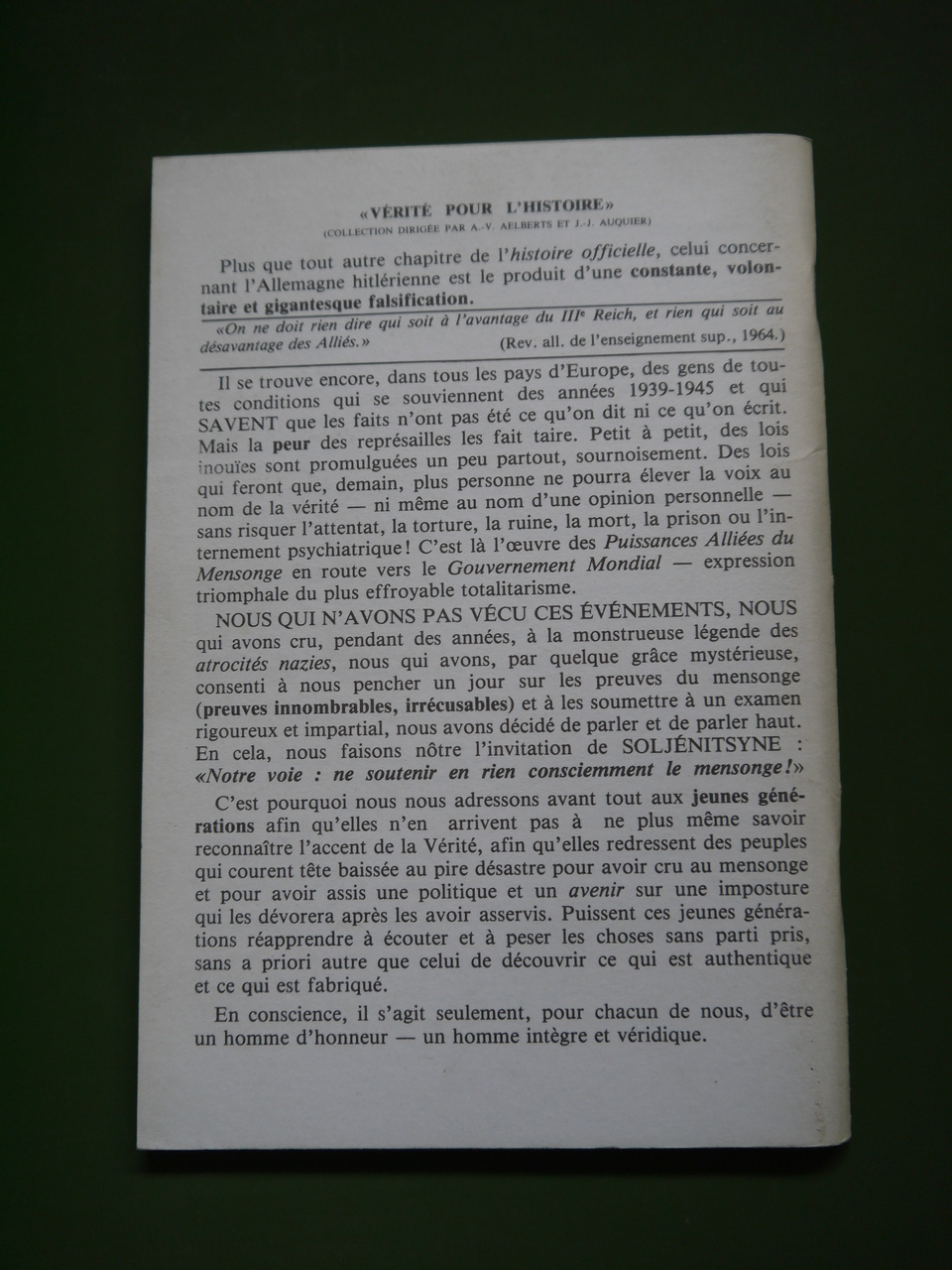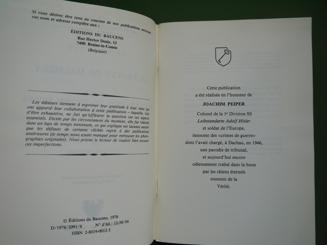 Les éditions du Baucens, à vocation révisionniste, étaient établies à Braine-le-Comte. Ouvrage ouvertement favorable à l’officier nazi accusé de crimes de guerre.