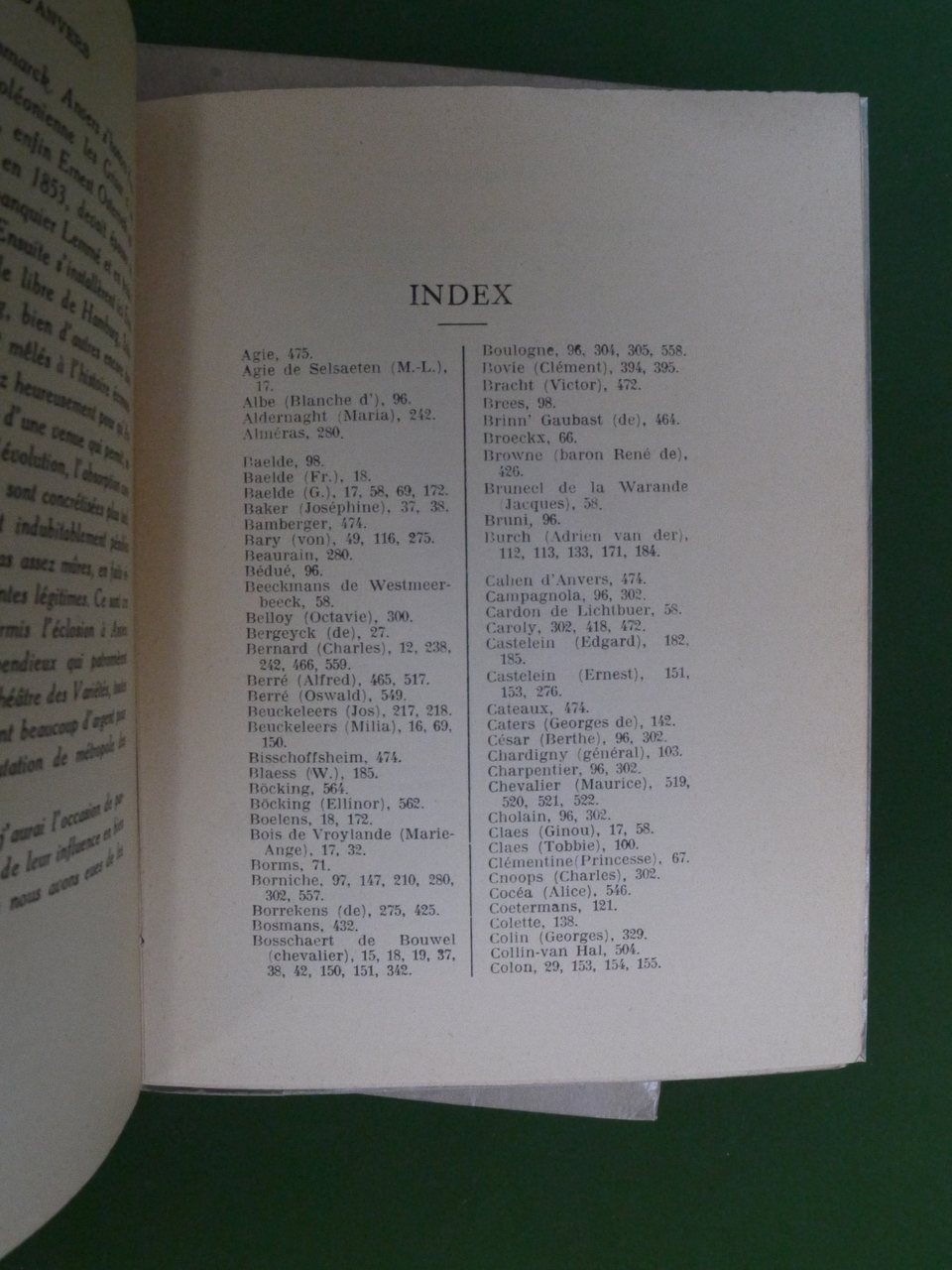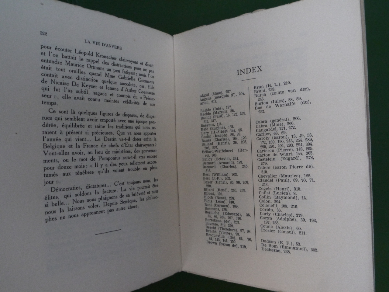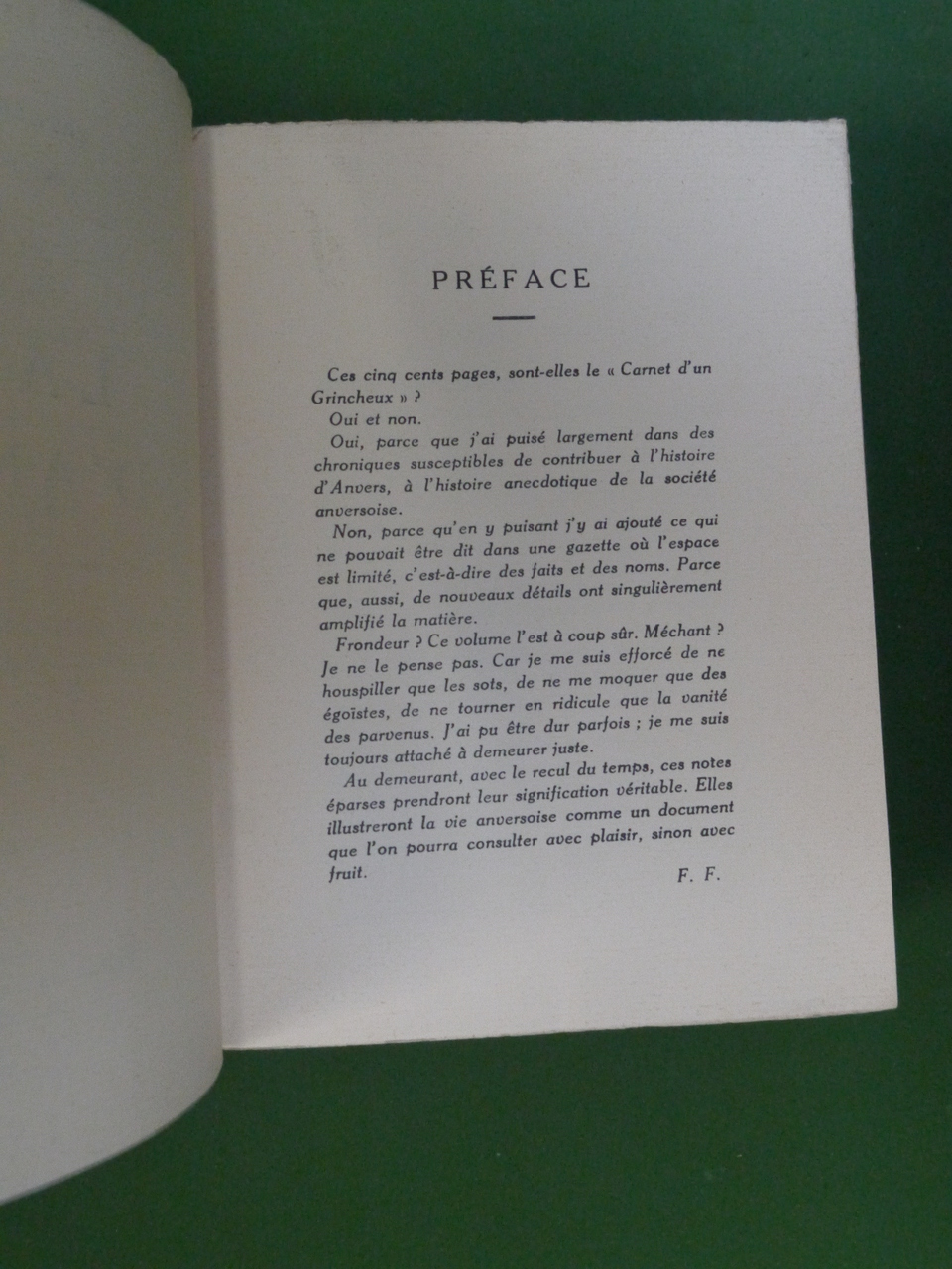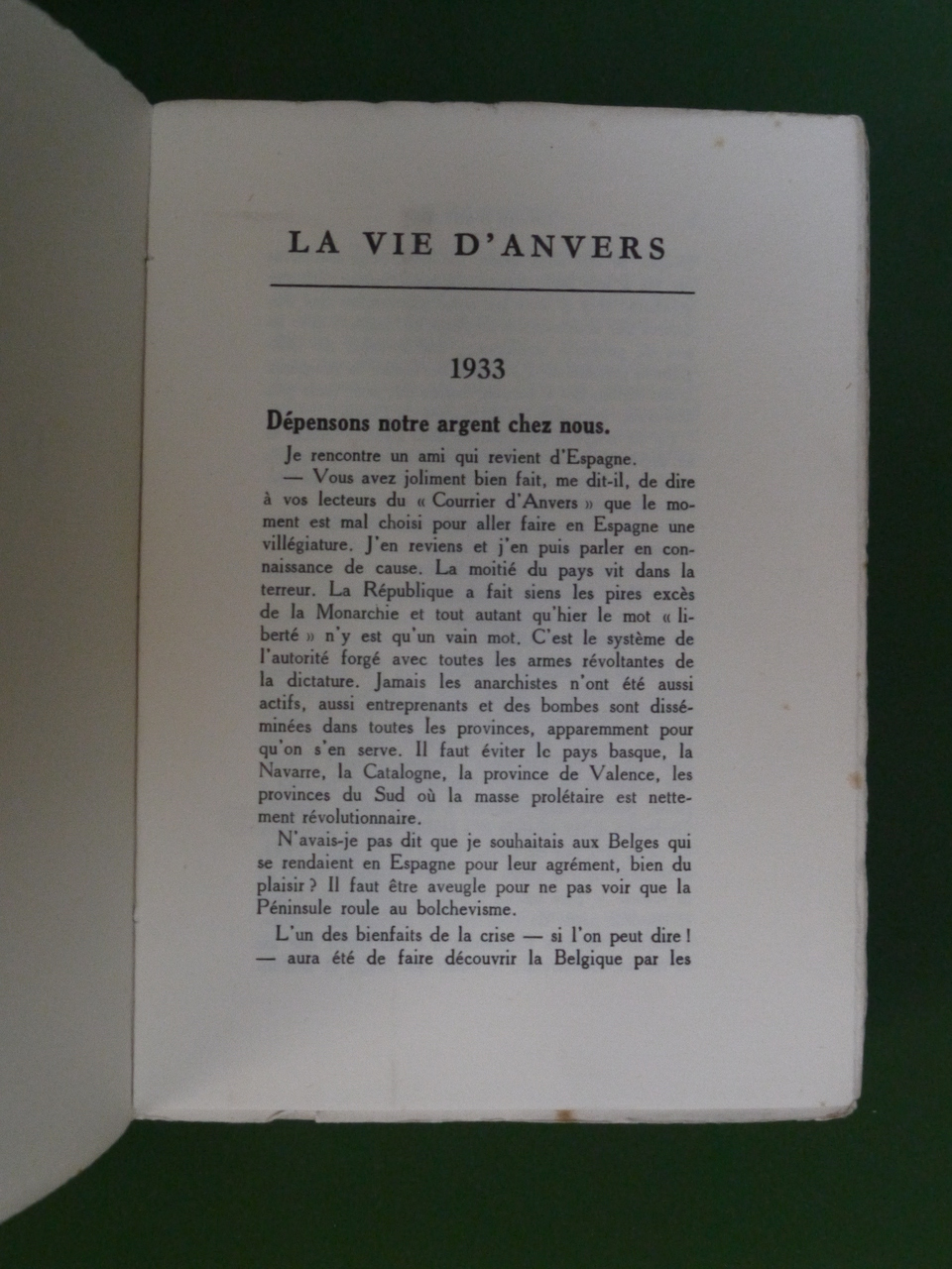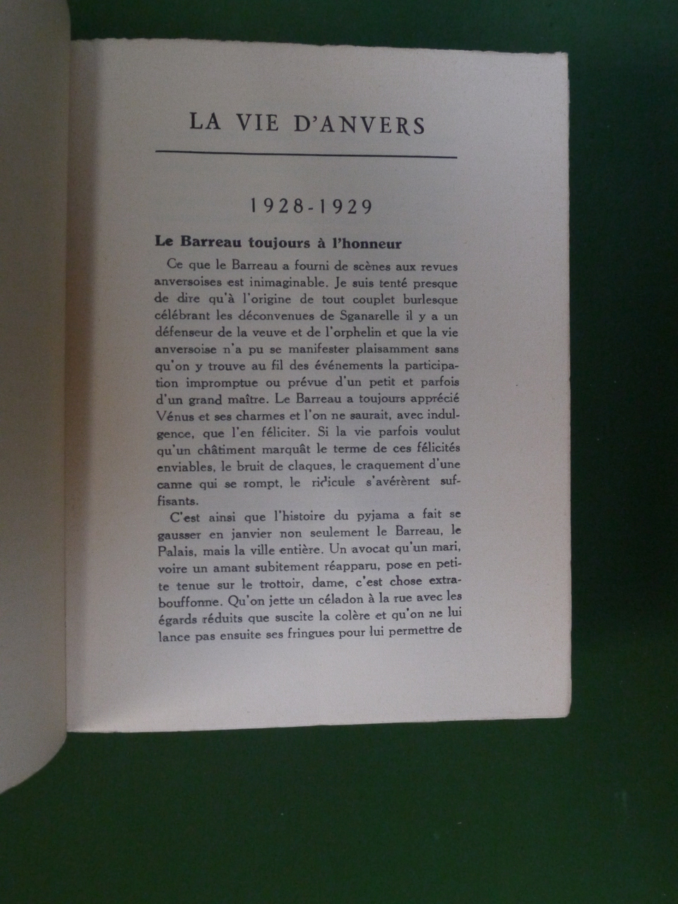 Un des 40 exemplaires sur « vergé à la main » (tome 1) ou « featherweight velin anglais » (tome 2). « Histoire anecdotique de la société anversoise » des années 1920 et 30. Où l’on lit par exemple: « Ce Léon Degrelle est un toqué roublard. (…) Léon Degrelle, si on le laisse faire, nous fera voir du pays! »