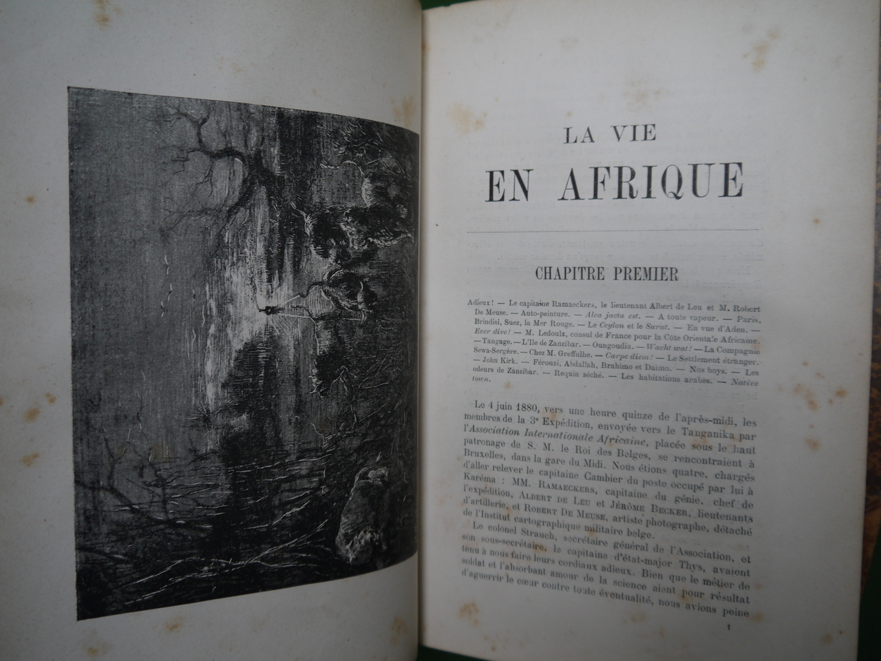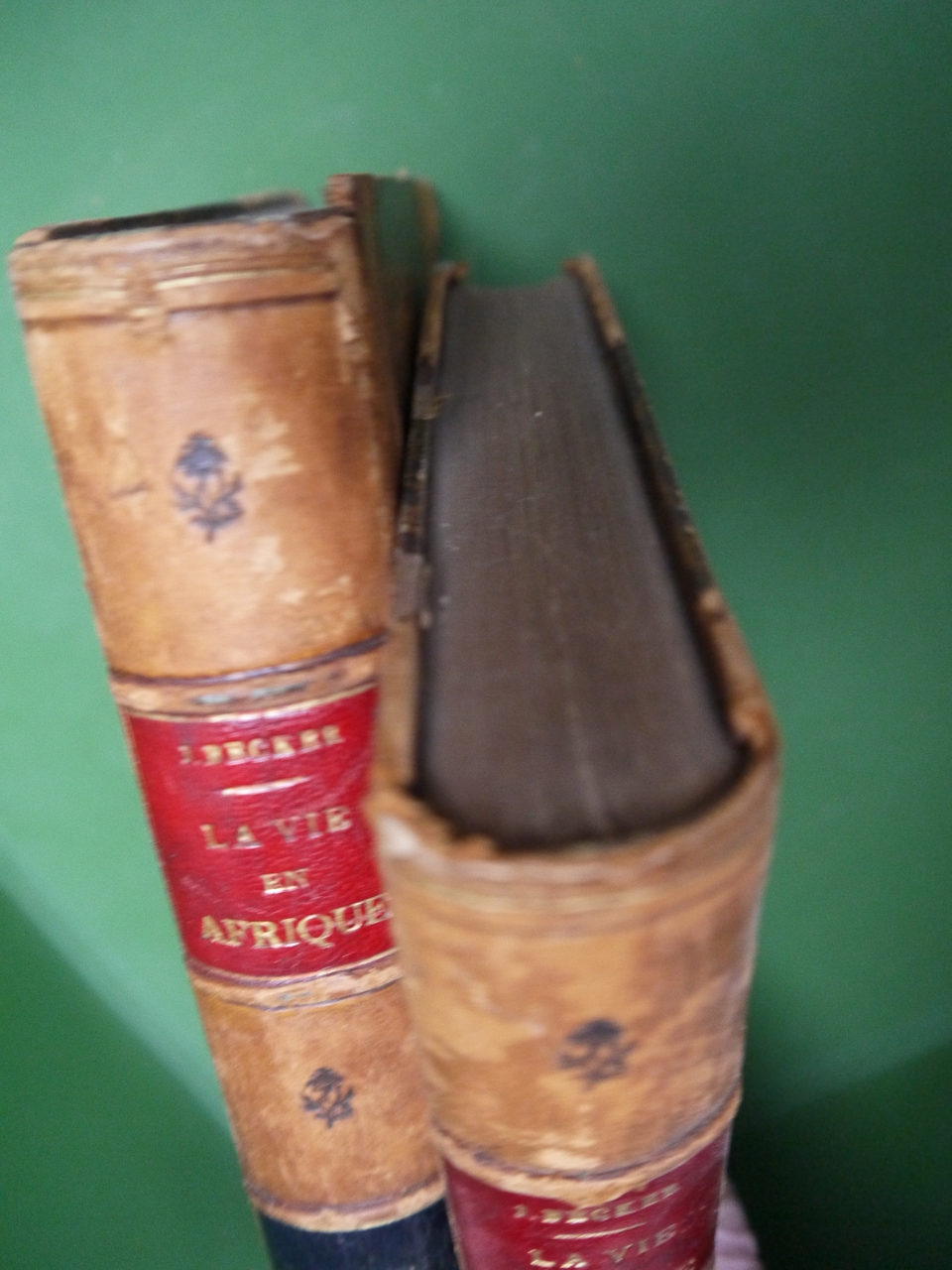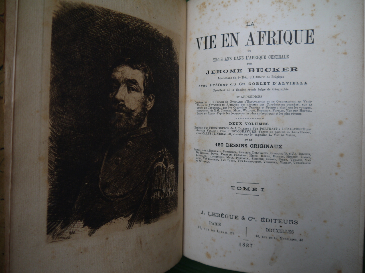 « … ou 3 ans dans l’Afrique centrale ». L’auteur était « Lieutenant du 5e régiment d’artillerie de Belgique ». La table des matière, décrite en page de titre, est riche, avec notamment « 150 dessins originaux » et un « vade-mecum du voyageur en Afrique ». Nombreuses rousseurs. La reliure du tome 2 demande quelques soins urgents!