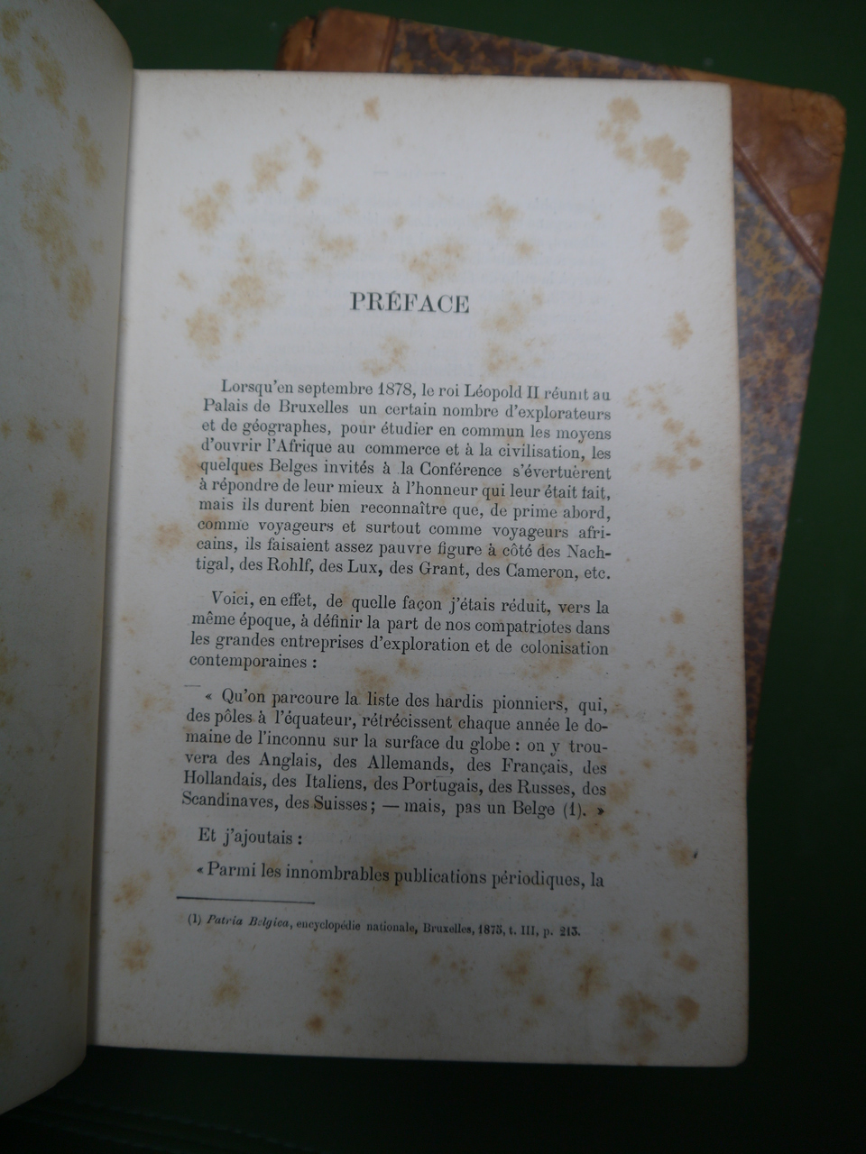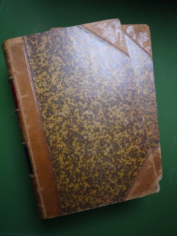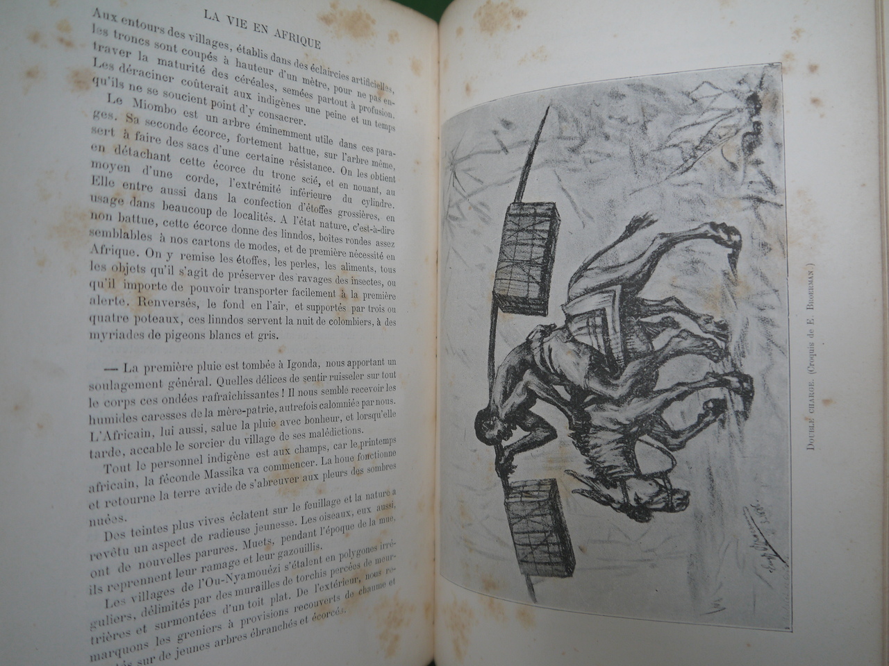 « … ou 3 ans dans l’Afrique centrale ». L’auteur était « Lieutenant du 5e régiment d’artillerie de Belgique ». La table des matière, décrite en page de titre, est riche, avec notamment « 150 dessins originaux » et un « vade-mecum du voyageur en Afrique ». Nombreuses rousseurs. La reliure du tome 2 demande quelques soins urgents!