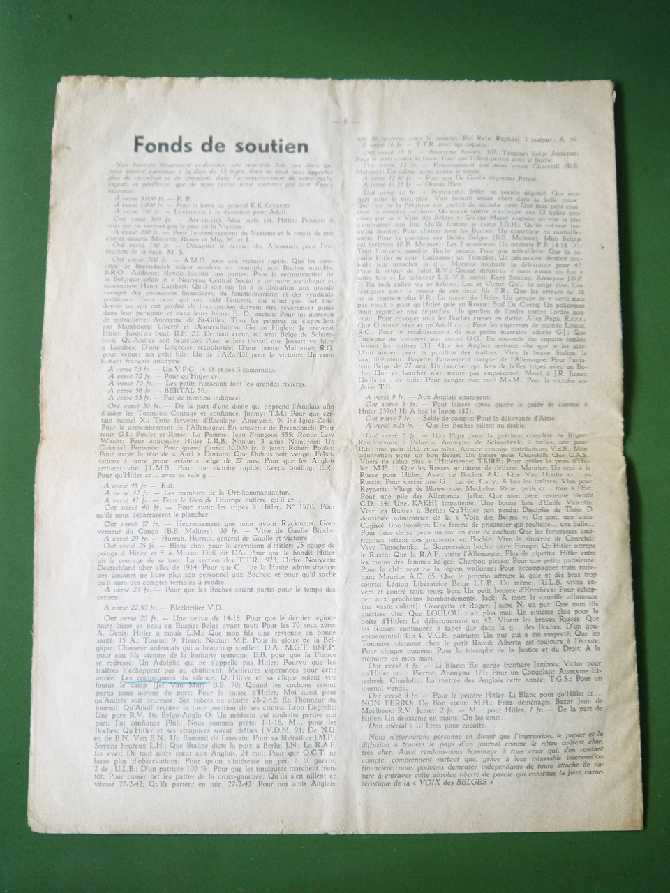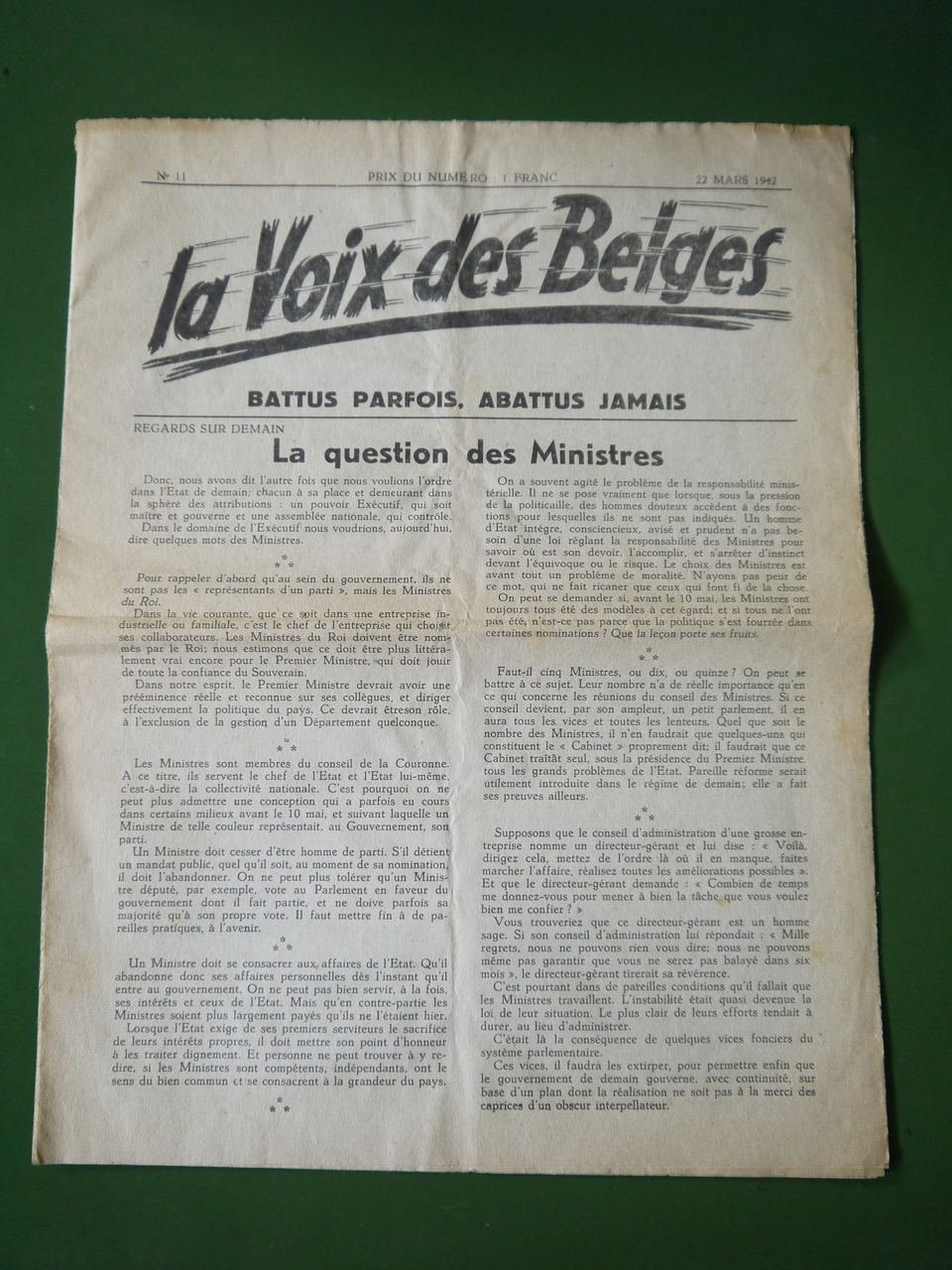 La Voix des belges numéro 11, daté du 22 mars 1942, avec sa devise « Battus parfois, abattus jamais ! ». Ce journal était l’émanation du MNB, mouvement national belge, dont la plupart des membres seront arrêtés, entre 1941 et 1944. 8 pages, avec notamment une charge vengeresse contre Pierre Daye.