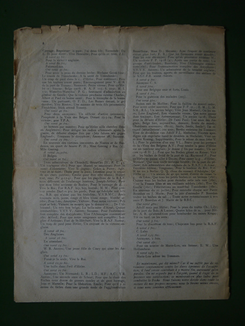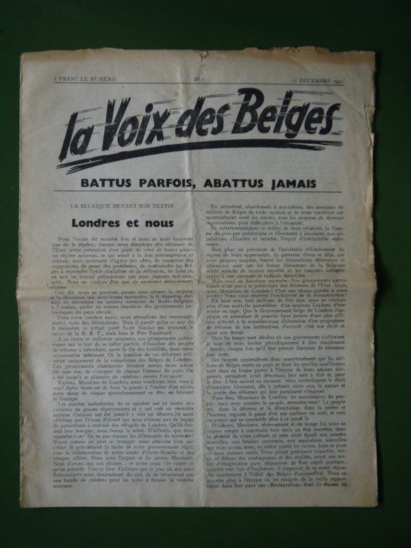 La Voix des belges numéro 7, daté du 31 décembre 1941, avec sa devise « Battus parfois, abattus jamais ! ». Ce journal était l’émanation du MNB, mouvement national belge, dont la plupart des membres seront arrêtés, entre 1941 et 1944. 8 pages.