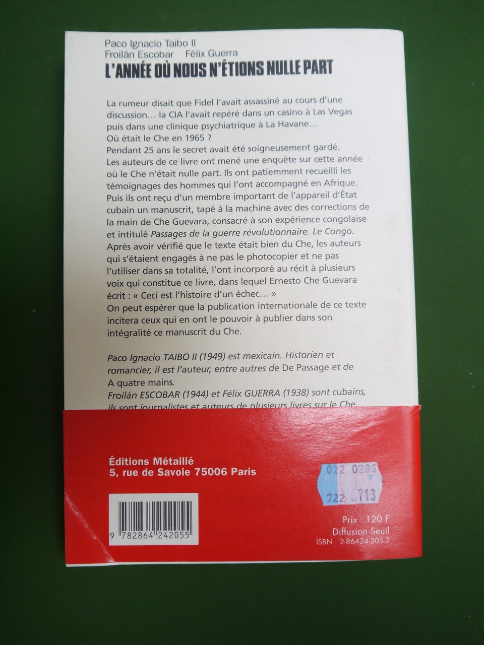 « Extraits du journal de Ernesto Che Guevara en Afrique » incorporés dans un récit écrit par Paco Ignacio Taibo II, Froilan Escobar, Félix Guerra et des témoins d’époque. On n’apprit que 25 ans plus tard que le Che passa l’année 1965 au Congo.