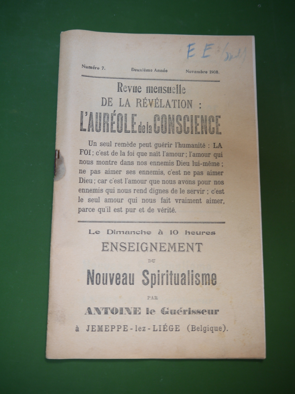 Le numéro 7 (deuxième année) de la revue qui diffusait la pensée d’Antoine le guérisseur, véritable icône liégeoise… Parution en novembre 1908. 16 pages.