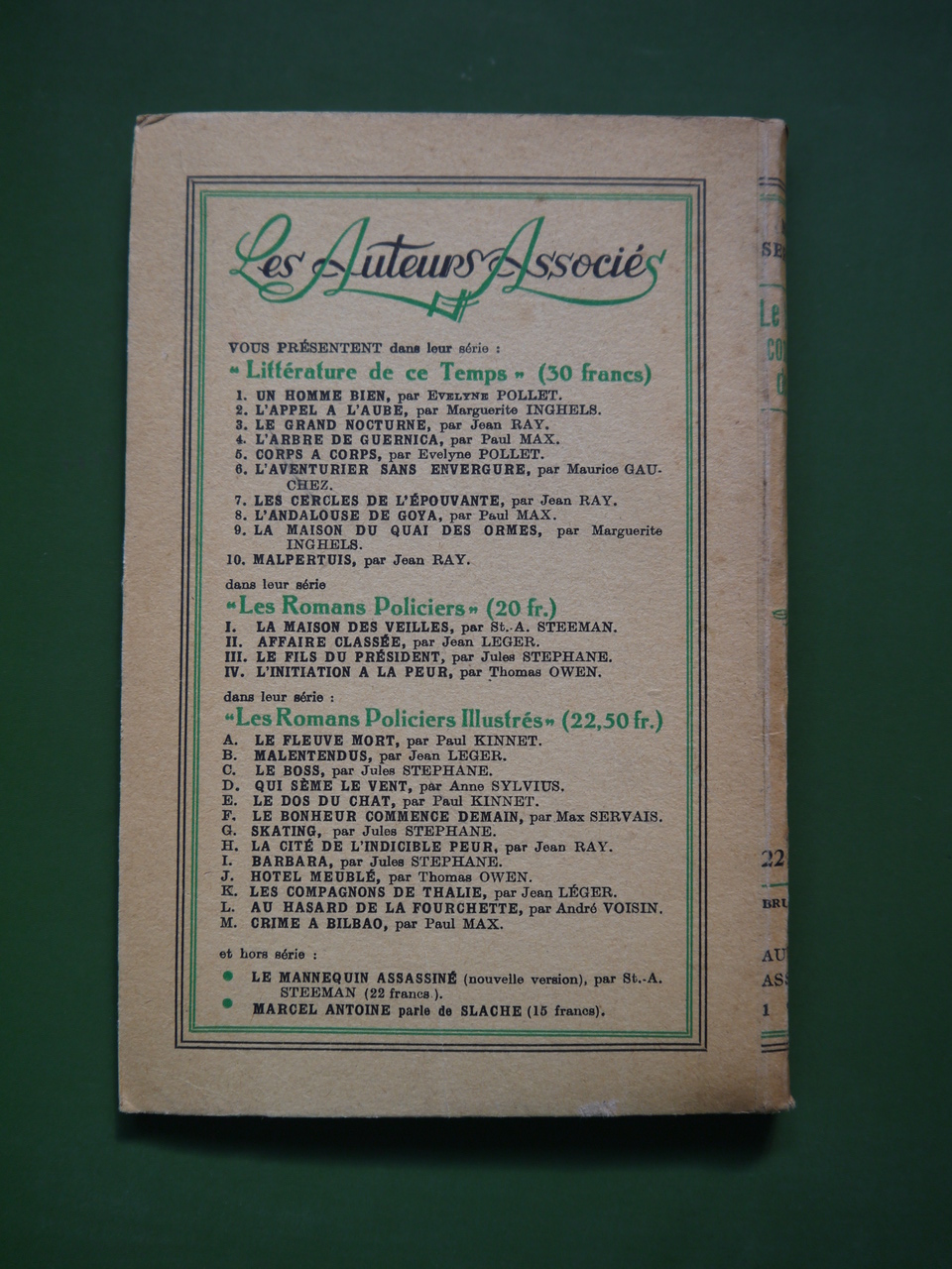 Les Auteurs associés comptaient également dans leurs rangs Jean Ray, Stanislas-André Steeman, Thomas Owen, Marcel Marien… Le bandeau présentant ce roman annonçait un « meurtre dans l’ivresse »!