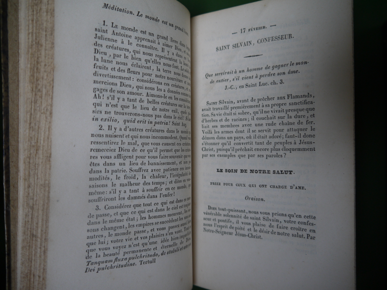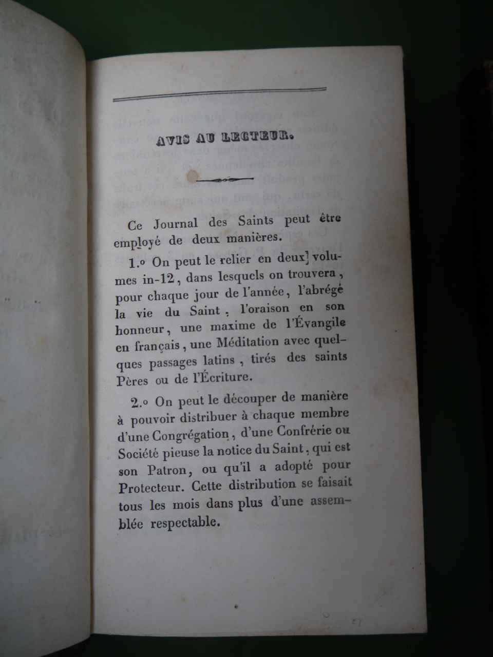 « Contenant un abrégé de leur vie, et une méditation pour chaque jour de l’année, tirée ou de la vie du saint, ou d’une maxime de l’Evangile ». Cette « nouvelle édition très soignée » d’un texte édité depuis un siècle environ fut imprimée à Alost…