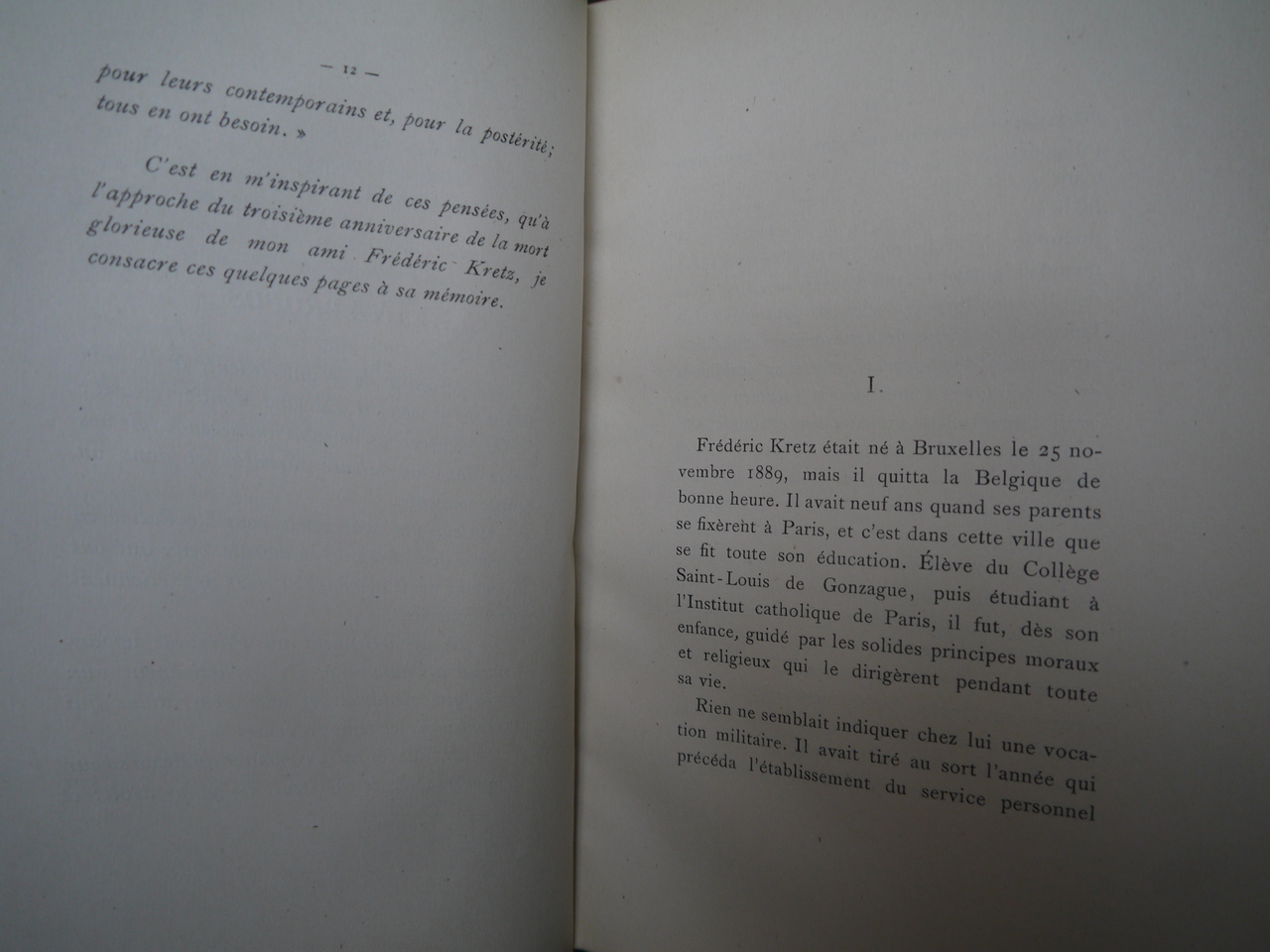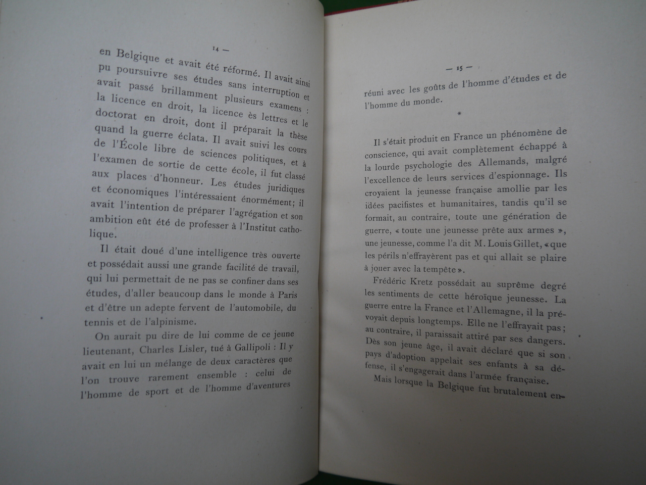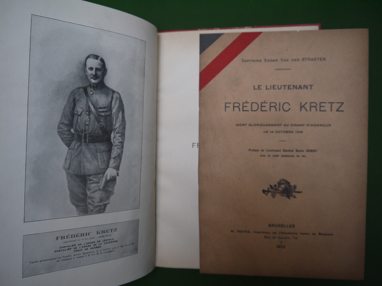 « Mort glorieusement au champ d’honneur le 14 octobre 1918 ». Le 14 Octobre 1918, à la tête de sa compagnie, le lieutenant Kretz entre d’un seul élan dans les lignes ennemies de la Flandernstellung, au Sud de Handzaeme, en bousculant plusieurs groupes de fantassins allemands. C’est là qu’il fut foudroyé par une balle en pleine poitrine au milieu de ses compagnons d’armes. Exemplaire relié.
