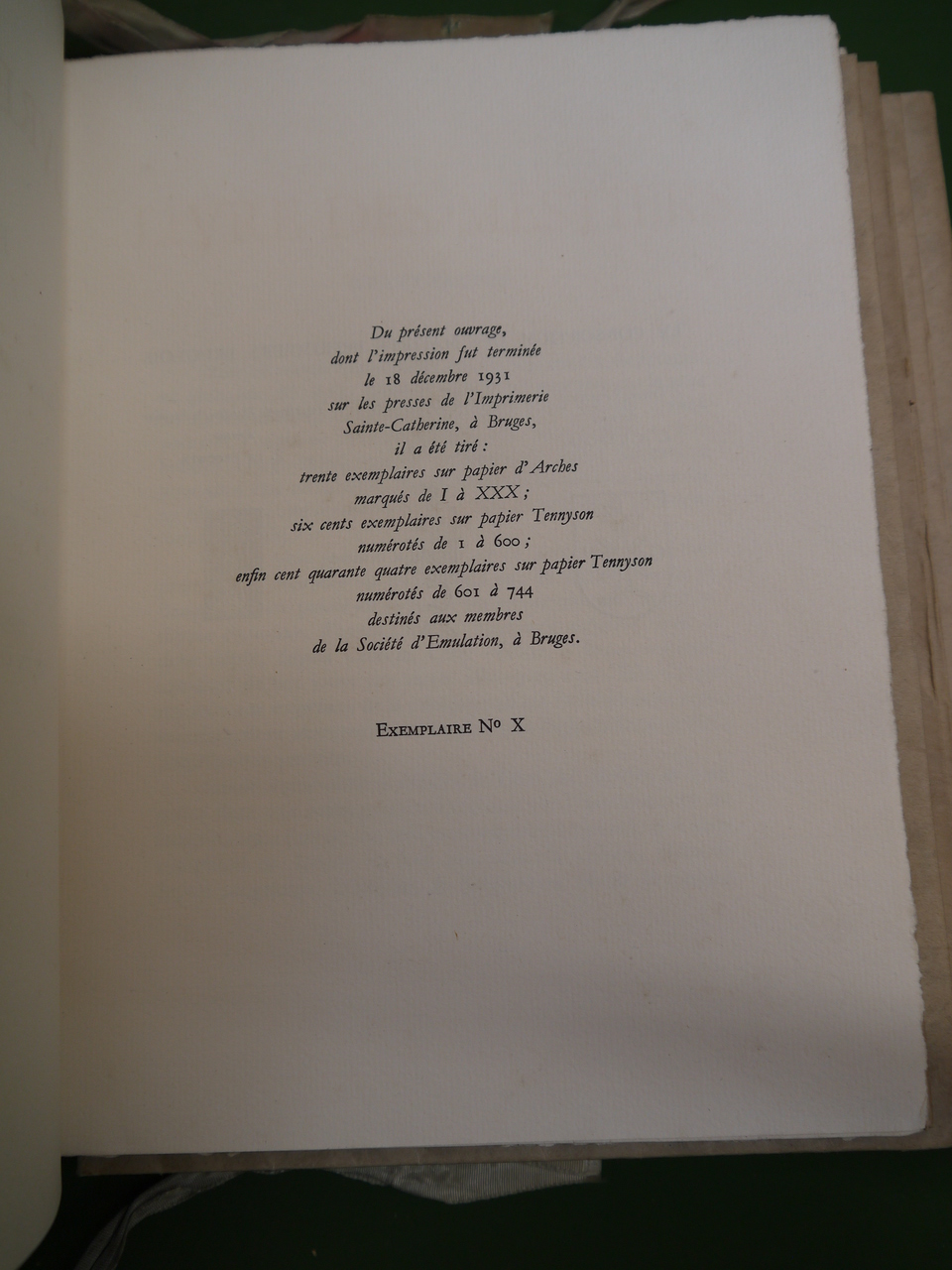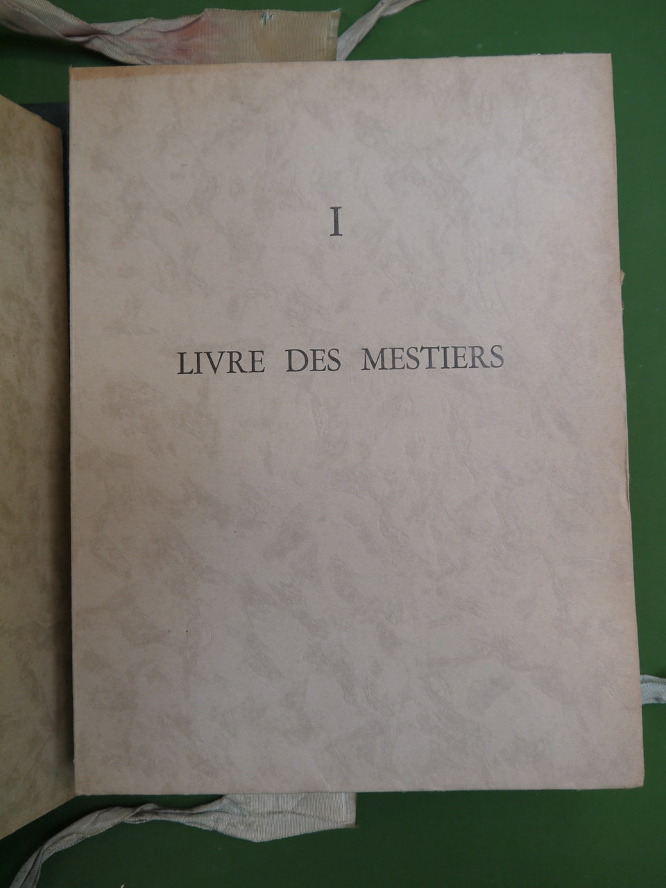 Un des 30 exemplaires sur Arches, sur un tirage total de 744 exemlplaires. Ensemble de 6 volumes sous farde dont 2 de présentation de l’ouvrage (FR + NL) et « quatre anciens manuels de conversation ». La version originale du Livre des mestiers date de 1349 et propose des dialogues bilingues composés afin d’enseigner le français à des locuteurs du néerlandais (voire aussi du bas-allemand). Parution des versions en allemand en 1420, en anglais en 1483 et celle en flamand en 1501.
