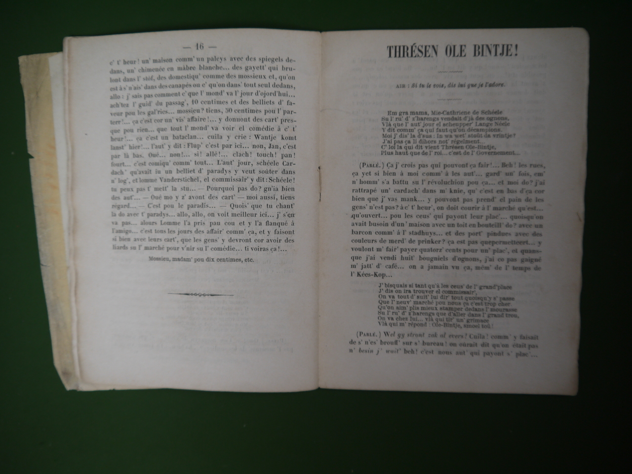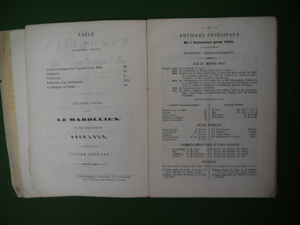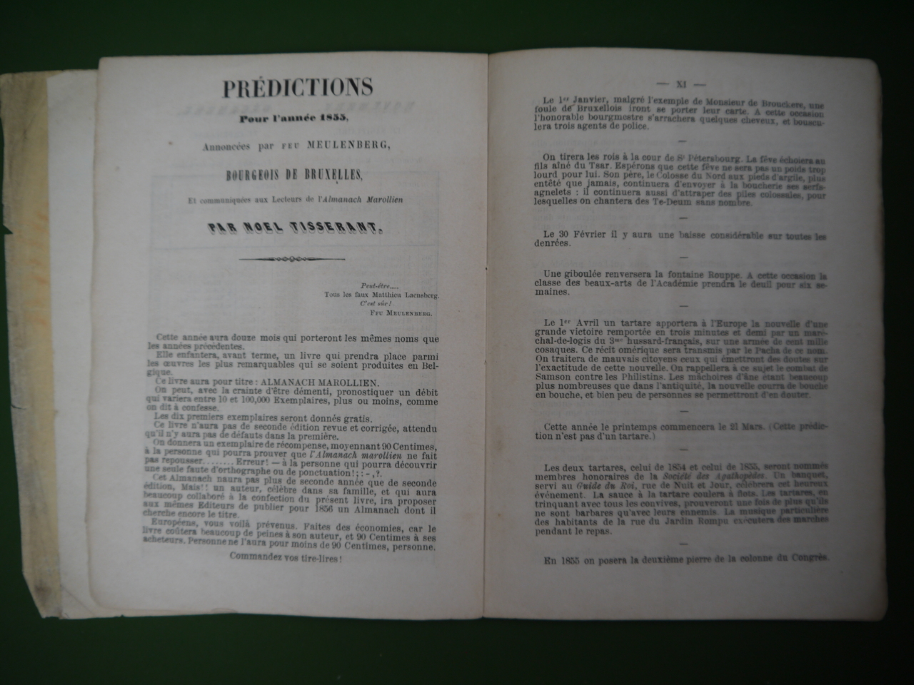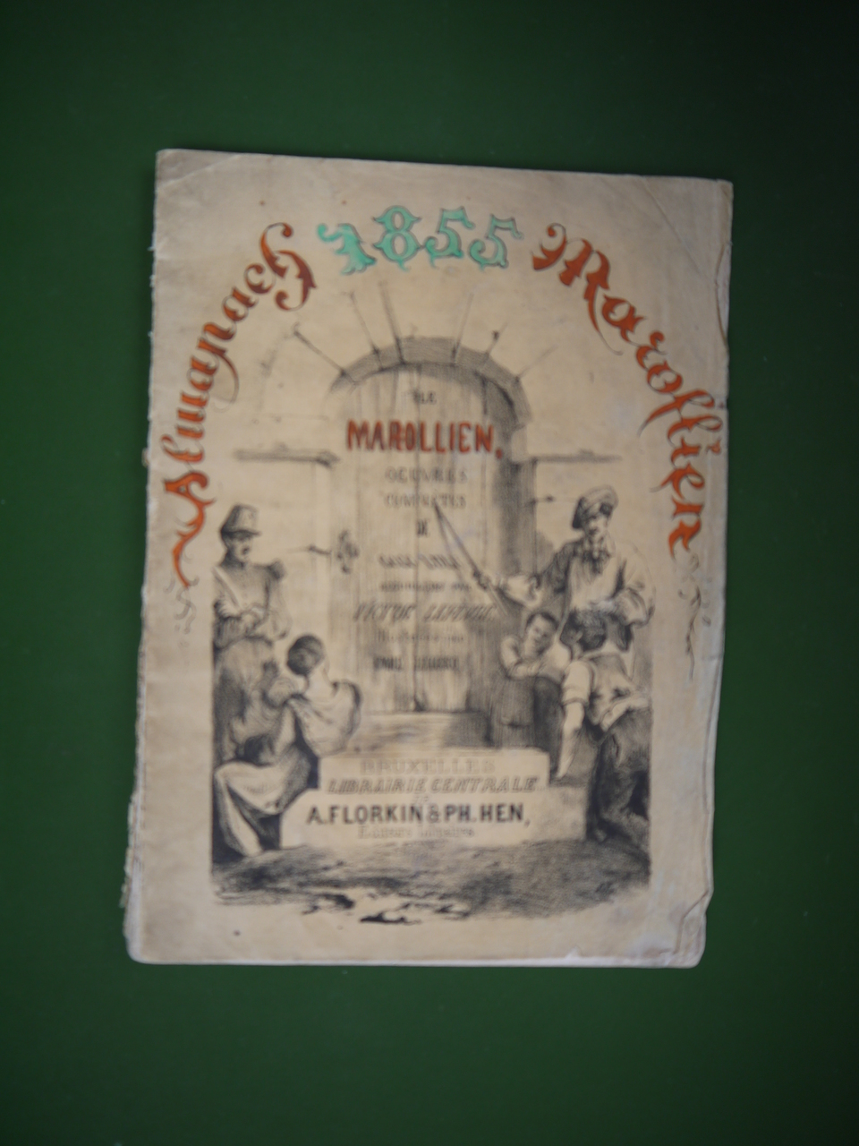 Il s’agit plus précisément de l' »Almanach marollien pour 1855 -première année – illustré par Emile Leclercq, première partie par Feu Meulenberg & Noel Tisserant, deuxième partie par Coco Lulu & Victor Lefèvre », Coco Lulu étant un pseudo de Victor lefèvre lui-même… La couverture de ce petit bijou est malheureusement totalement détachée de l’ensemble.