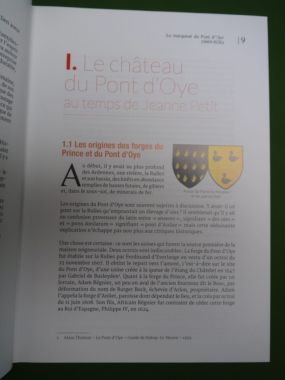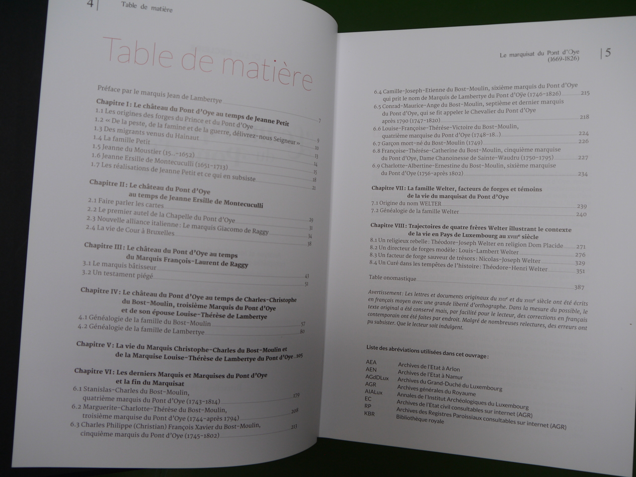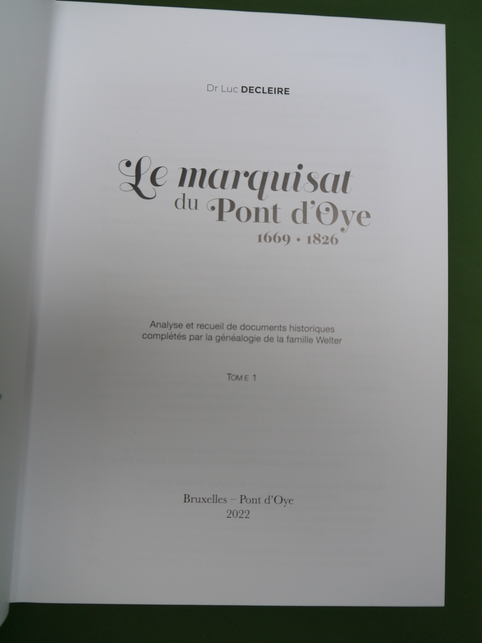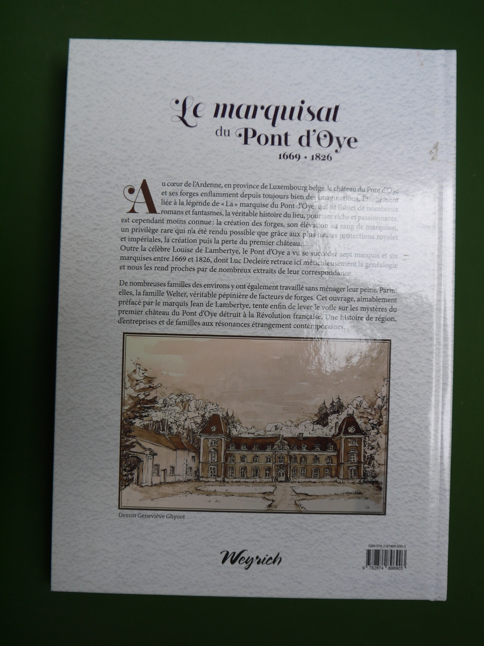 « Tome 1 – analyse et recueil de documents historiques complétés par la généalogie de la famille Welter ». Notice de l’éditeur: « Au cœur de l’Ardenne, en province de Luxembourg belge, le château du Pont d’Oye et ses forges enflamment depuis toujours bien des imaginations. Étroitement liée à la légende de « La » marquise du Pont d’Oye, qui fit l’objet de nombreux romans et fantasmes, la véritable histoire du lieu, pourtant riche et passionnante, est cependant moins connue : la création des forges, son élévation au rang de marquisat, un privilège rare qui n’a été rendu possible que grâce aux plus hautes protections royales et impériales, la création puis la perte du premier château… Outre la célèbre Louise de Lambertye, le Pont d’Oye a vu se succéder sept marquis et six marquises entre 1669 et 1826, dont Luc Decleire retrace ici méticuleusement la généalogie et nous les rend proches par de nombreux extraits de leur correspondance. De nombreuses familles des environs y ont également travaillé sans ménager leur peine. Parmi elles, la famille Welter, véritable pépinière de facteurs de forges. »