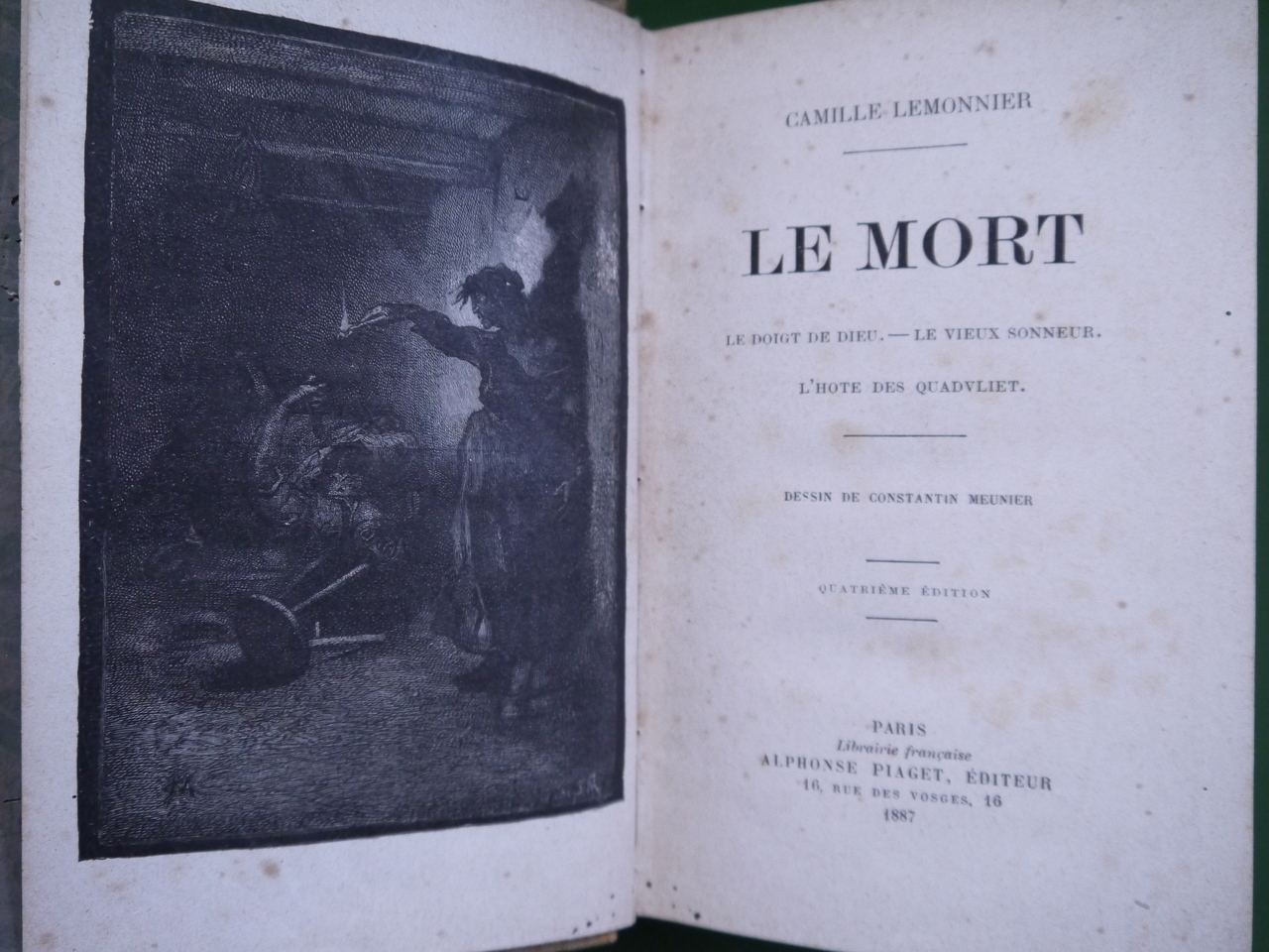 Contient également les textes « Le doigt de Dieu », « Le vieux sonneur » et « L’hôte des Quadvliet ». Avec un dessin de Constantin Meunier. Quatrième édition.