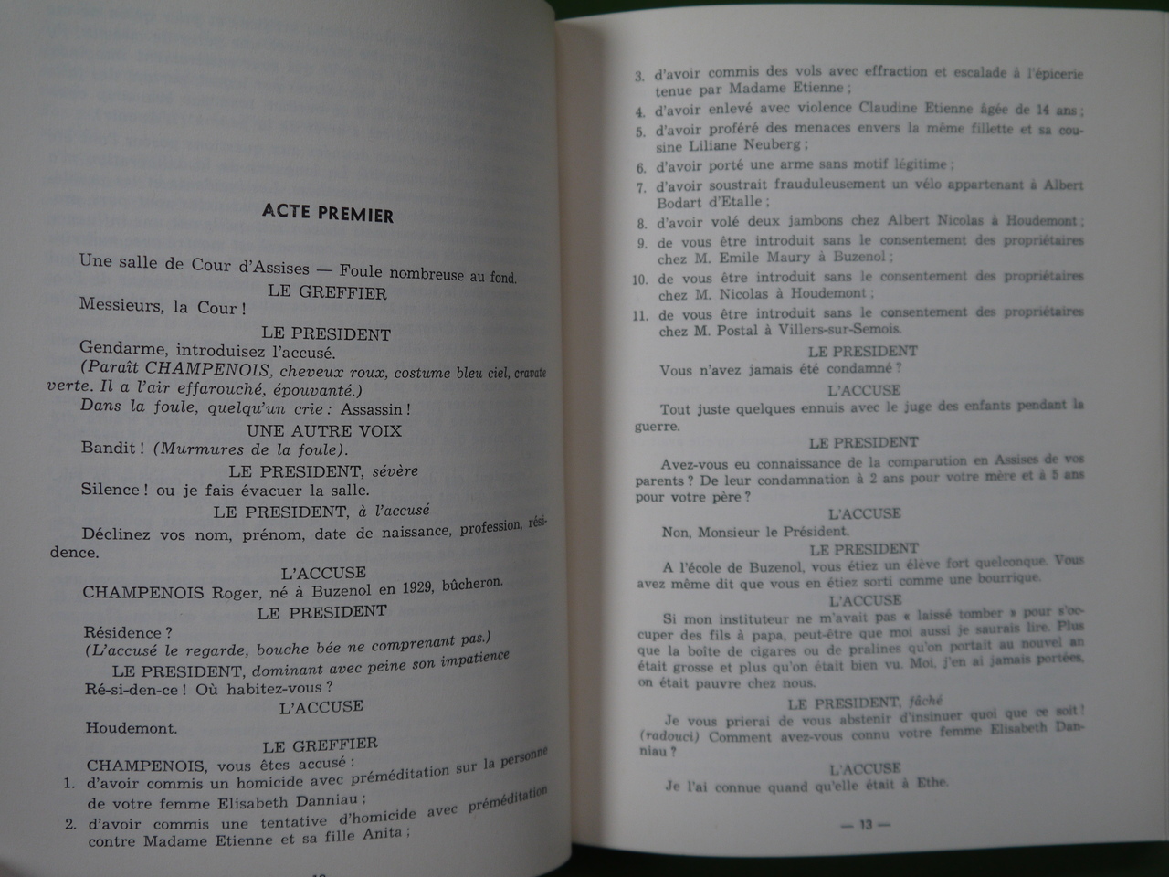 Une pièce en 5 actes qui met en scène le procès de Roger Champenois, accusé du meurtre de son épouse, en 1964. Albin Saint-Cerf est un des pseudonymes d’Albin Georges.