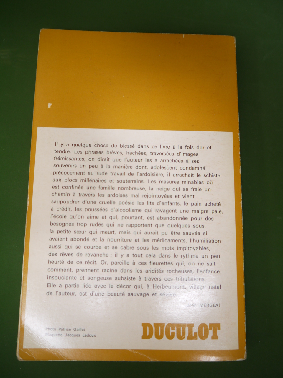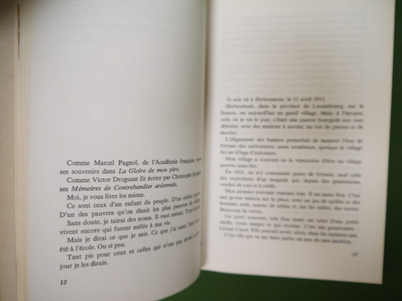 « Je suis né à Herbeumont, le 11 avril 1911. Herbeumont, dans la province de Luxembourg, sur la Semois, est aujourd’hui un gentil village. Mais, à l’époque, celle où je vis le jour, c’était une pauvre bourgade aux rues déjetées, avec des maisons à auvent, au toit de pierres et de mortier. L’alignement des fumiers permettait de mesurer l’état de fortune des cultivateurs, assez nombreux, quoique le village fut un village d’ardoisiers. » Première édition en 1969.