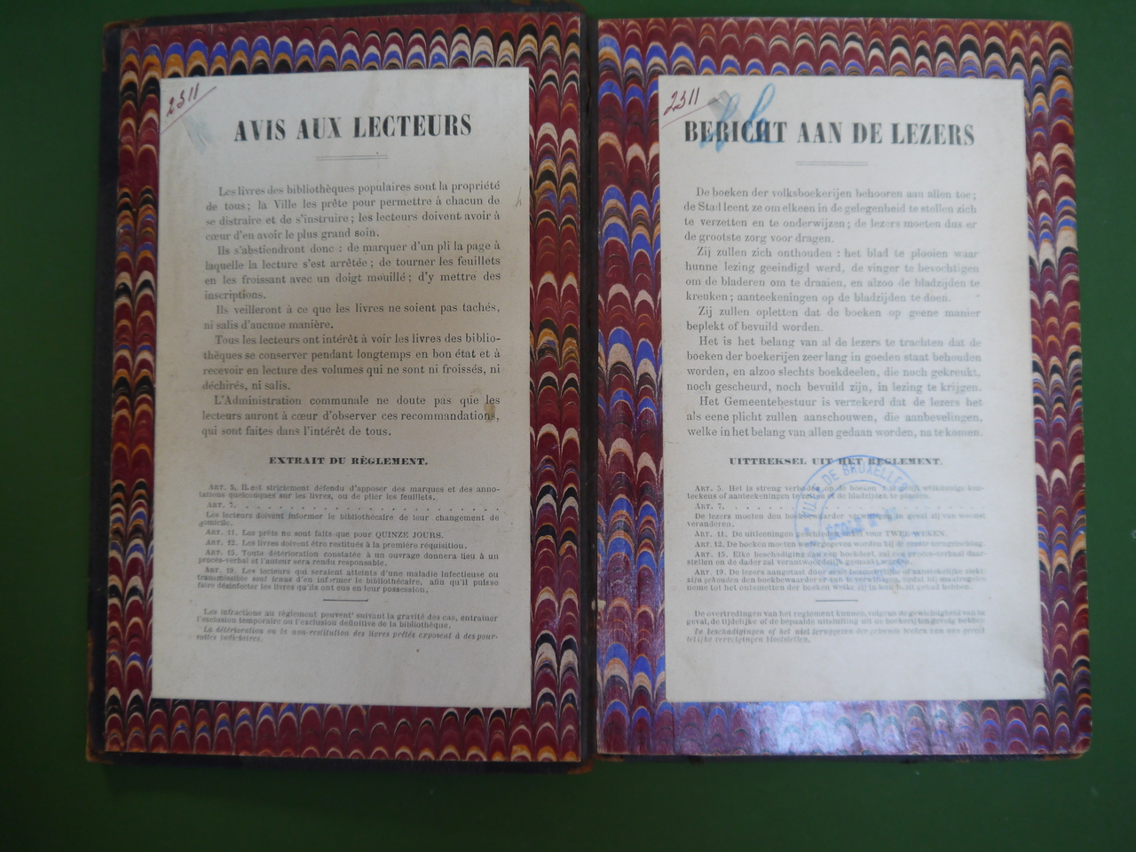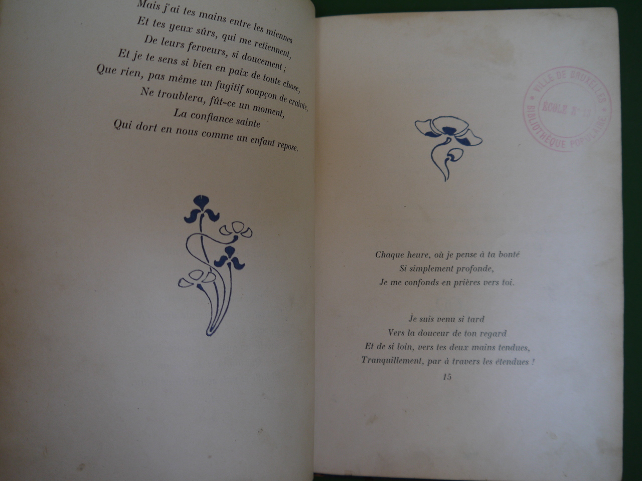 L’édition originale de ce titre, exemplaire relié pour la Bibliothèque d’une des écoles de la Ville de Bruxelles! Les ornements textuels sont semble-t-il l’oeuvre de l’artiste belge Théo van Rysselberghe.