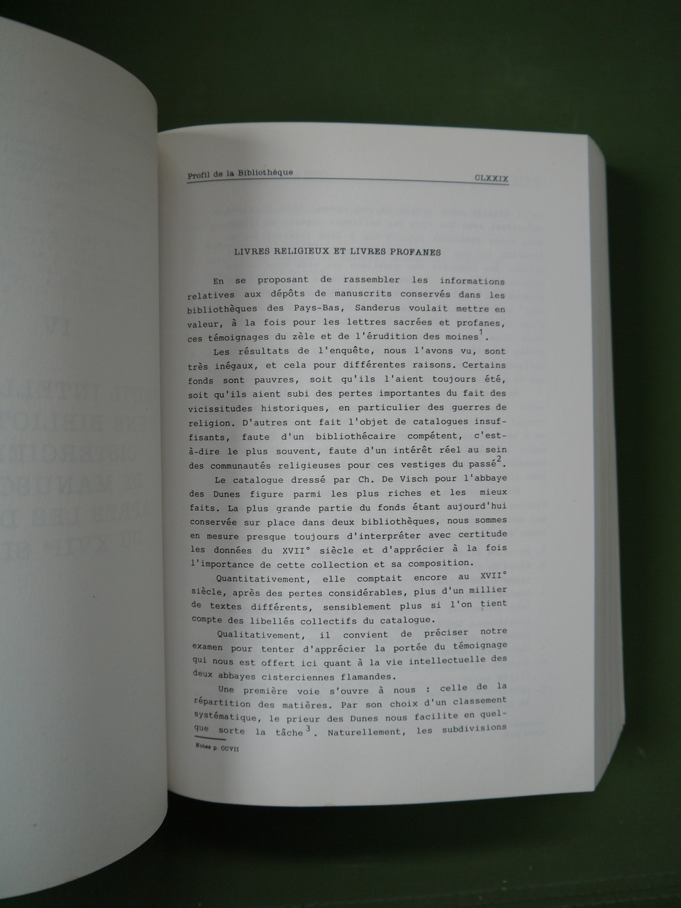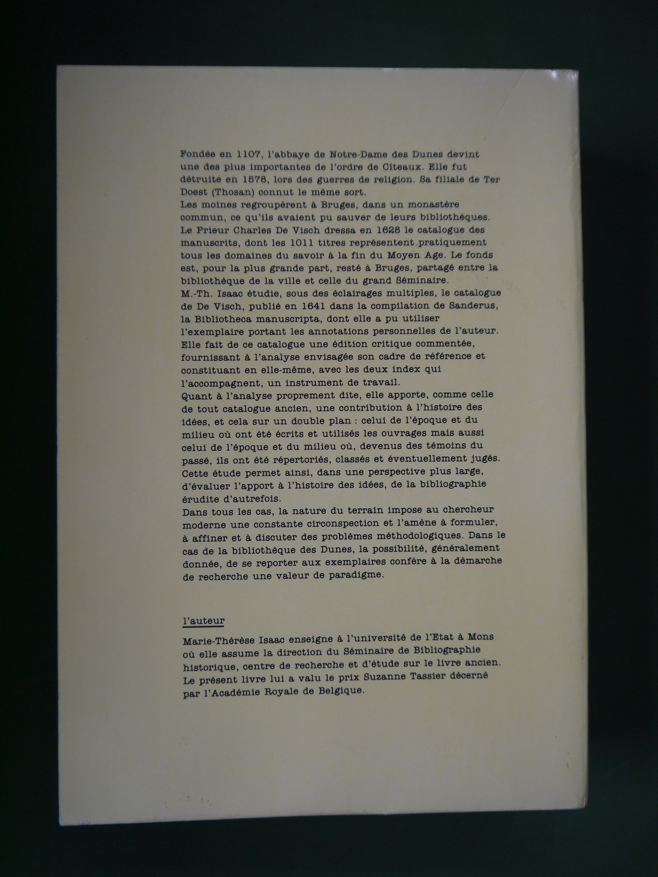 Le titre complet est « Les livres manuscrits de l’abbaye des dunes d’après le catalogue du 17e siècle ». L’abbaye des dunes, située à Koksijde, fut déplacée vers 1622 à Bruges après sa mise à sac par des calvinistes.