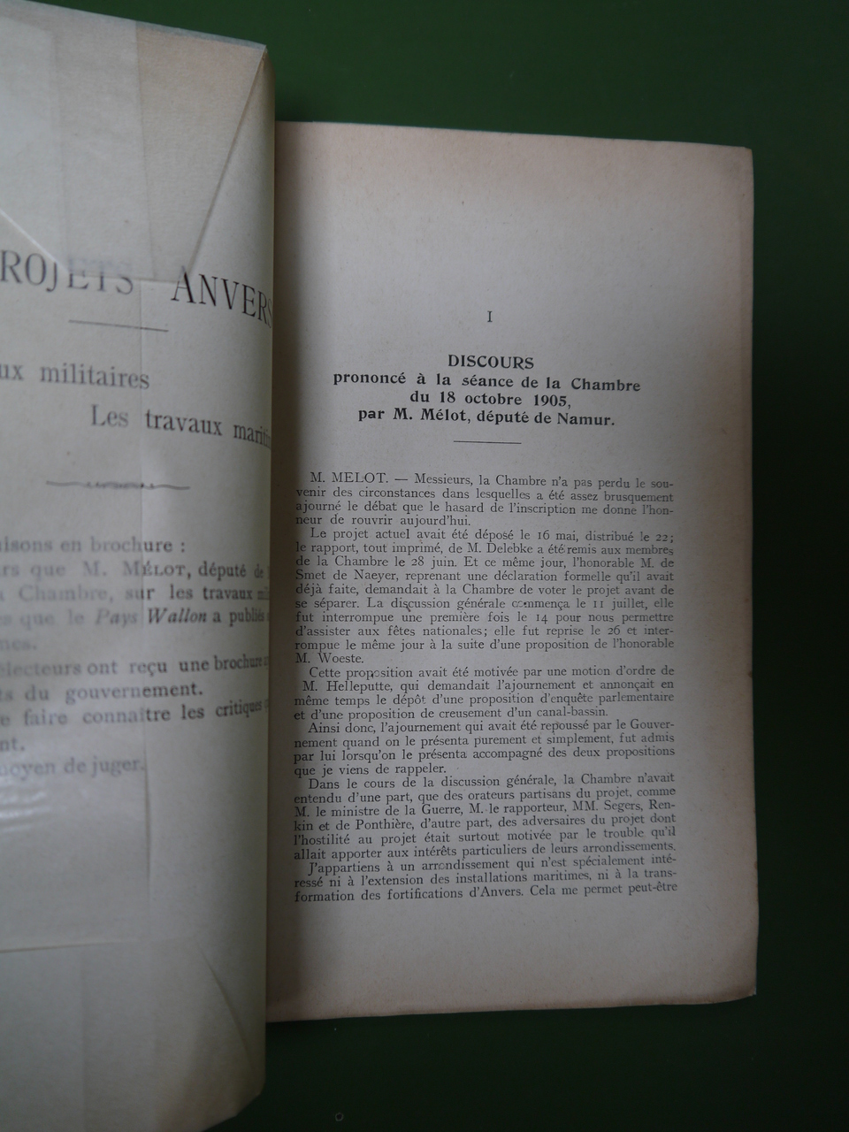 Discours de Mr Mélot, député de Namur, le 18 octobre 1905, sur les travaux militaires, suivi d’articles du Pays wallon sur les travaux maritimes. 48 pages.