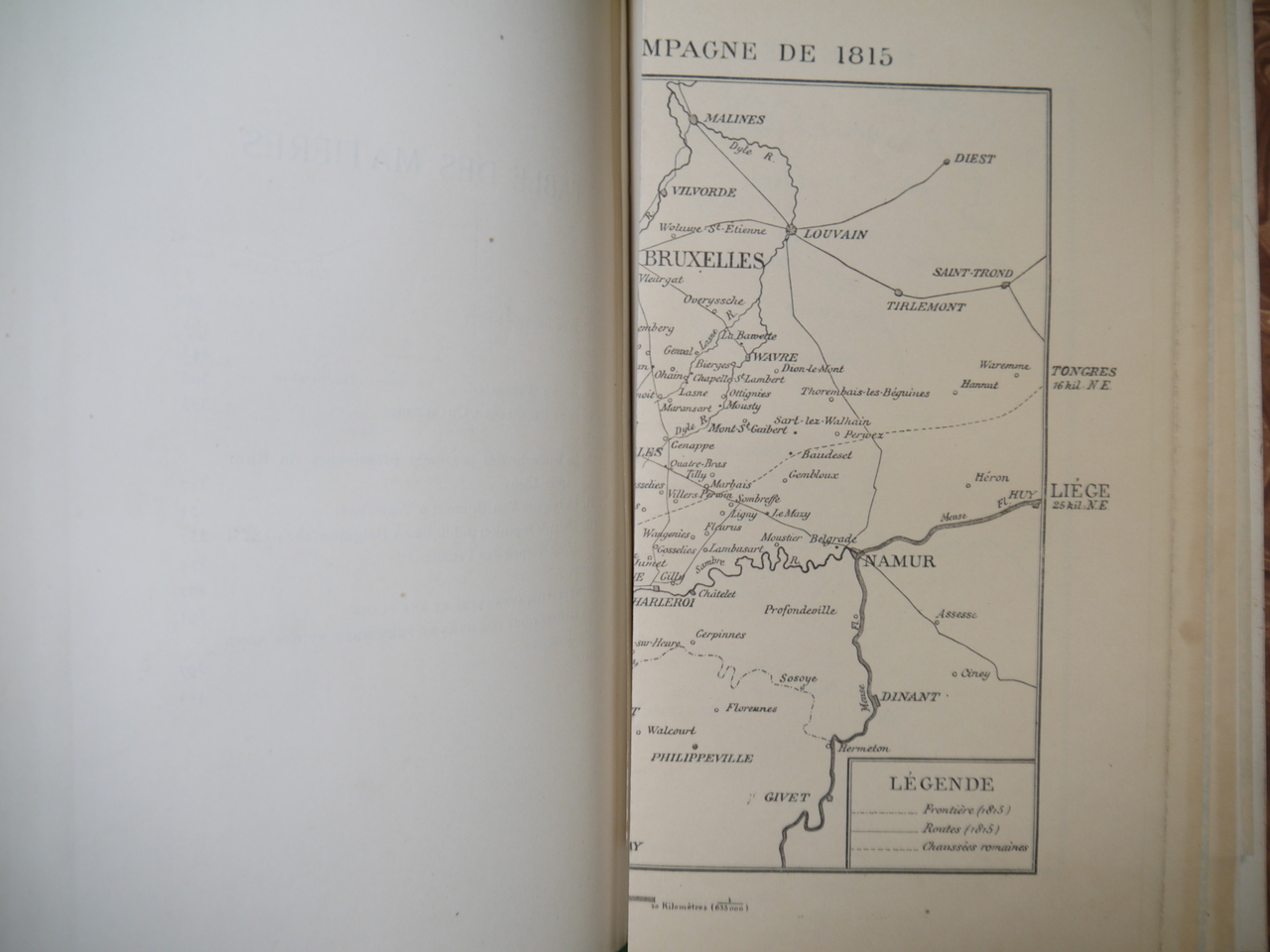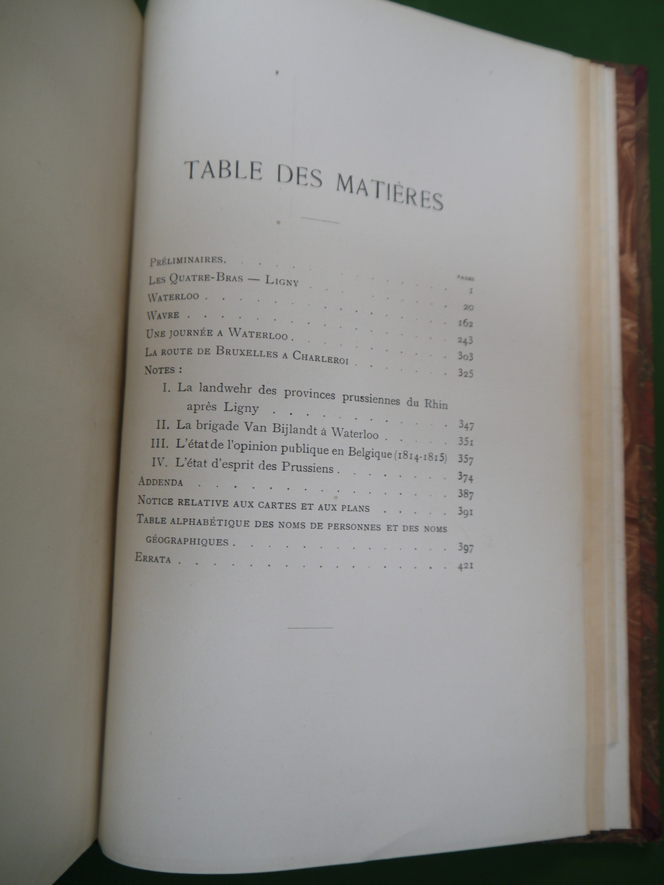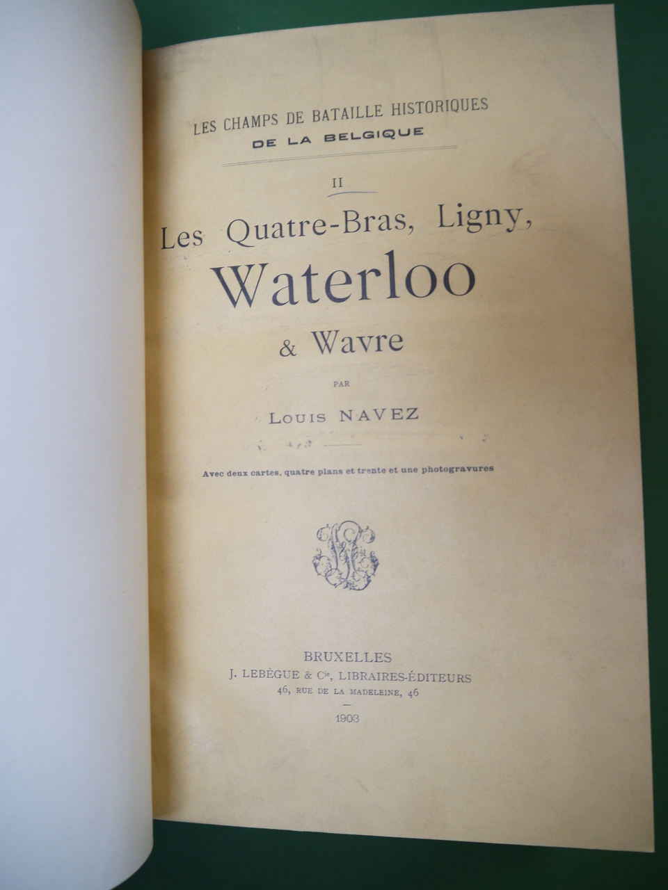 Sur-titre: « Les champs de bataille historiques de la Belgique ». Exemplaire relié provenant de la 1e édition des « Quatre-bras, Ligny, Waterloo et Wavre » (une secondre paraîtra en 1910), avec envoi de l’auteur à Mr Léon Fontaine. Mention de tome 2 sur le dos et en page de titre – un tome 1 des « Champs de bataille historiques de la Belgique » a bien paru en 1902 sous le titre « Depuis la bataille de Courtrai jusqu’à la campagne de 1815 ». Cartes et plans bien présents en fin d’ouvrage. Quelques ajouts ne figurent pas dans l’édition de 1910: « »Une journée à Waterloo », « La route de Bruxelles à Charleroi », ainsi que quelques dizaines de pages de notes diverses.