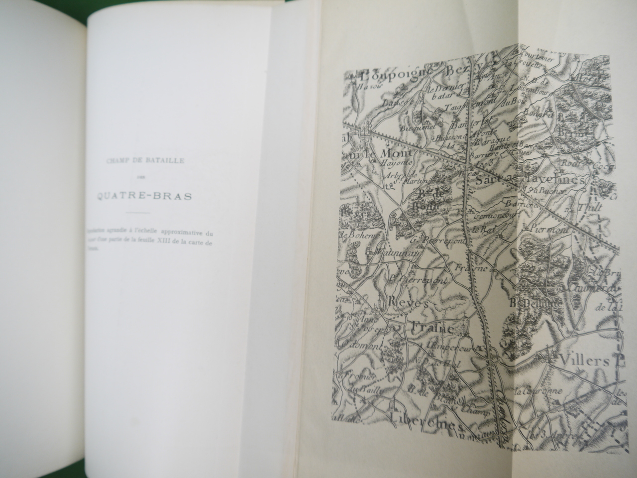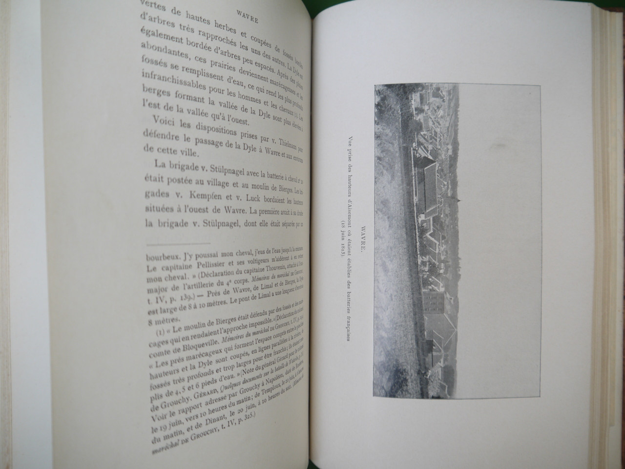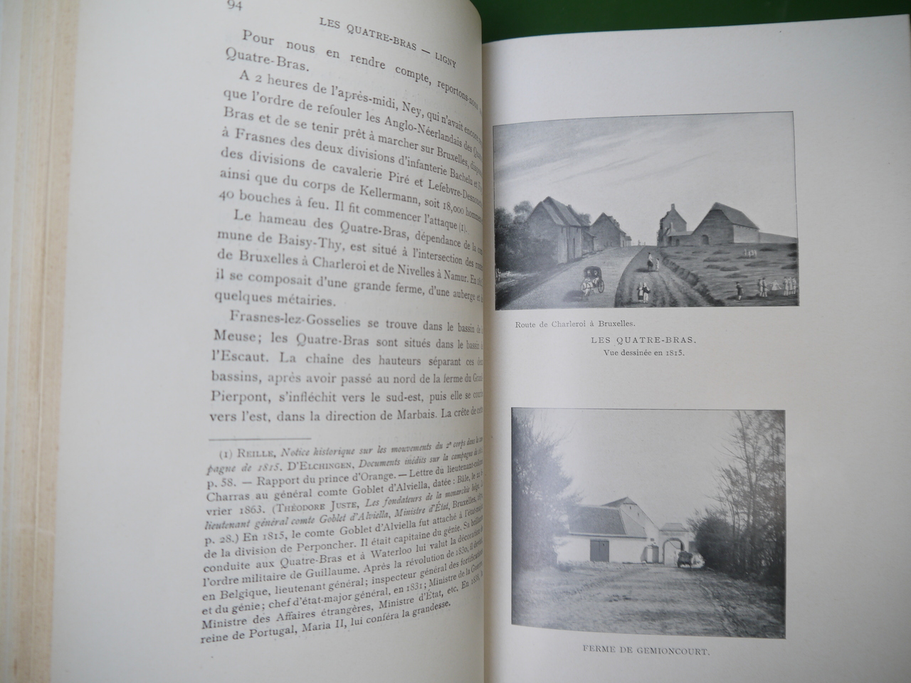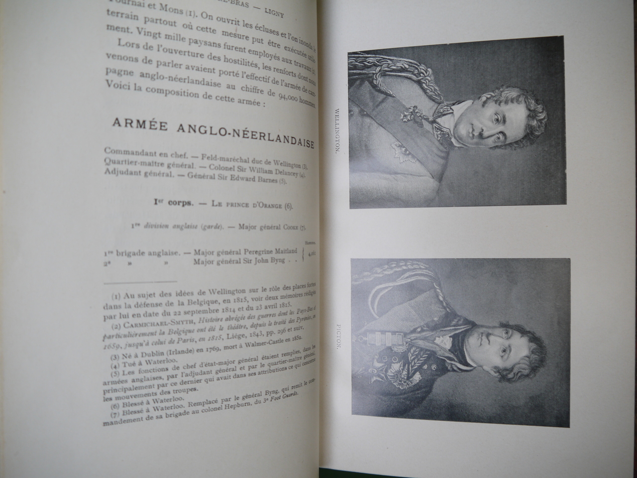 Sur-titre: « Les champs de bataille historiques de la Belgique ». Exemplaire relié provenant de la 1e édition des « Quatre-bras, Ligny, Waterloo et Wavre » (une secondre paraîtra en 1910), avec envoi de l’auteur à Mr Léon Fontaine. Mention de tome 2 sur le dos et en page de titre – un tome 1 des « Champs de bataille historiques de la Belgique » a bien paru en 1902 sous le titre « Depuis la bataille de Courtrai jusqu’à la campagne de 1815 ». Cartes et plans bien présents en fin d’ouvrage. Quelques ajouts ne figurent pas dans l’édition de 1910: « »Une journée à Waterloo », « La route de Bruxelles à Charleroi », ainsi que quelques dizaines de pages de notes diverses.
