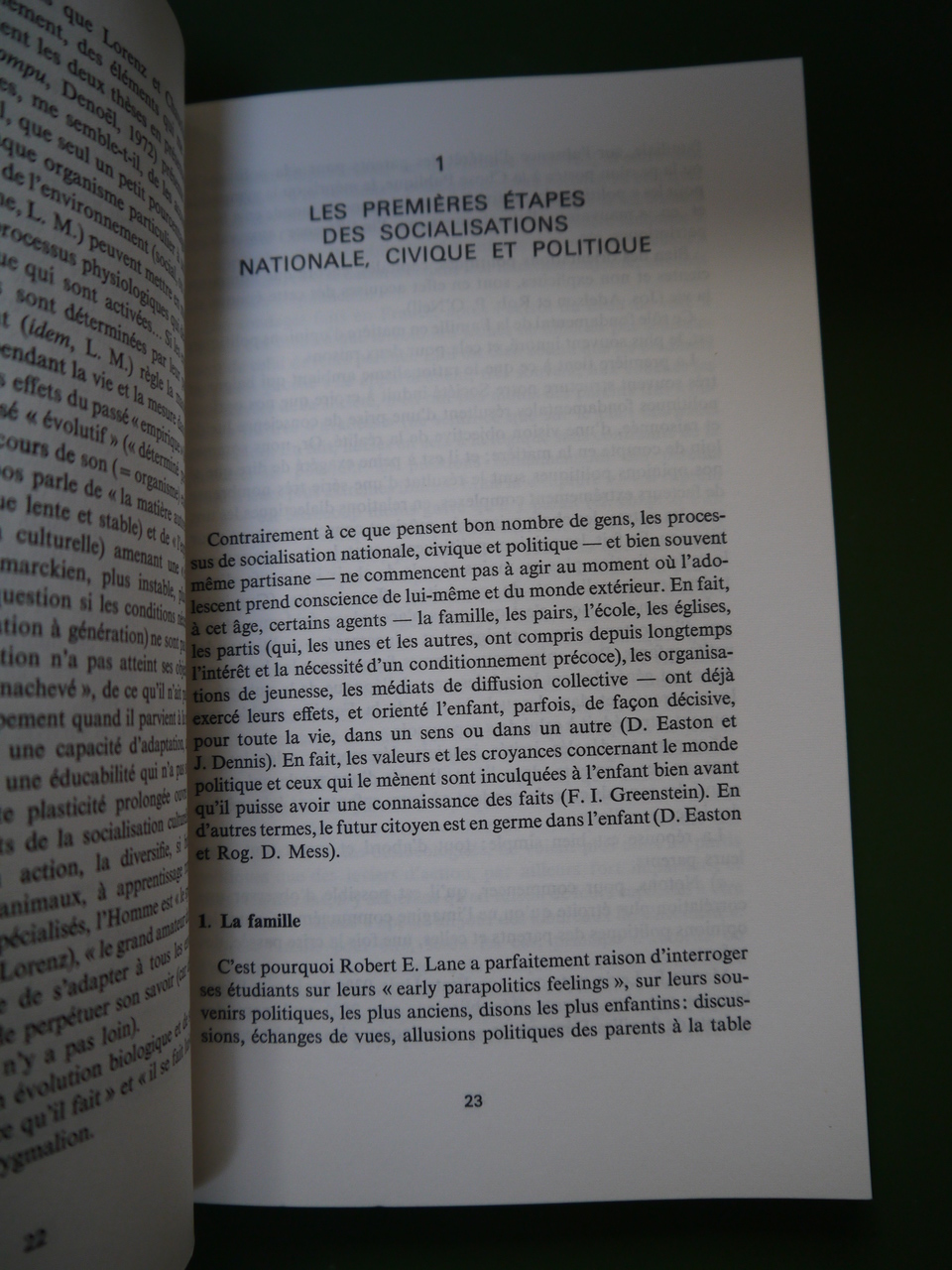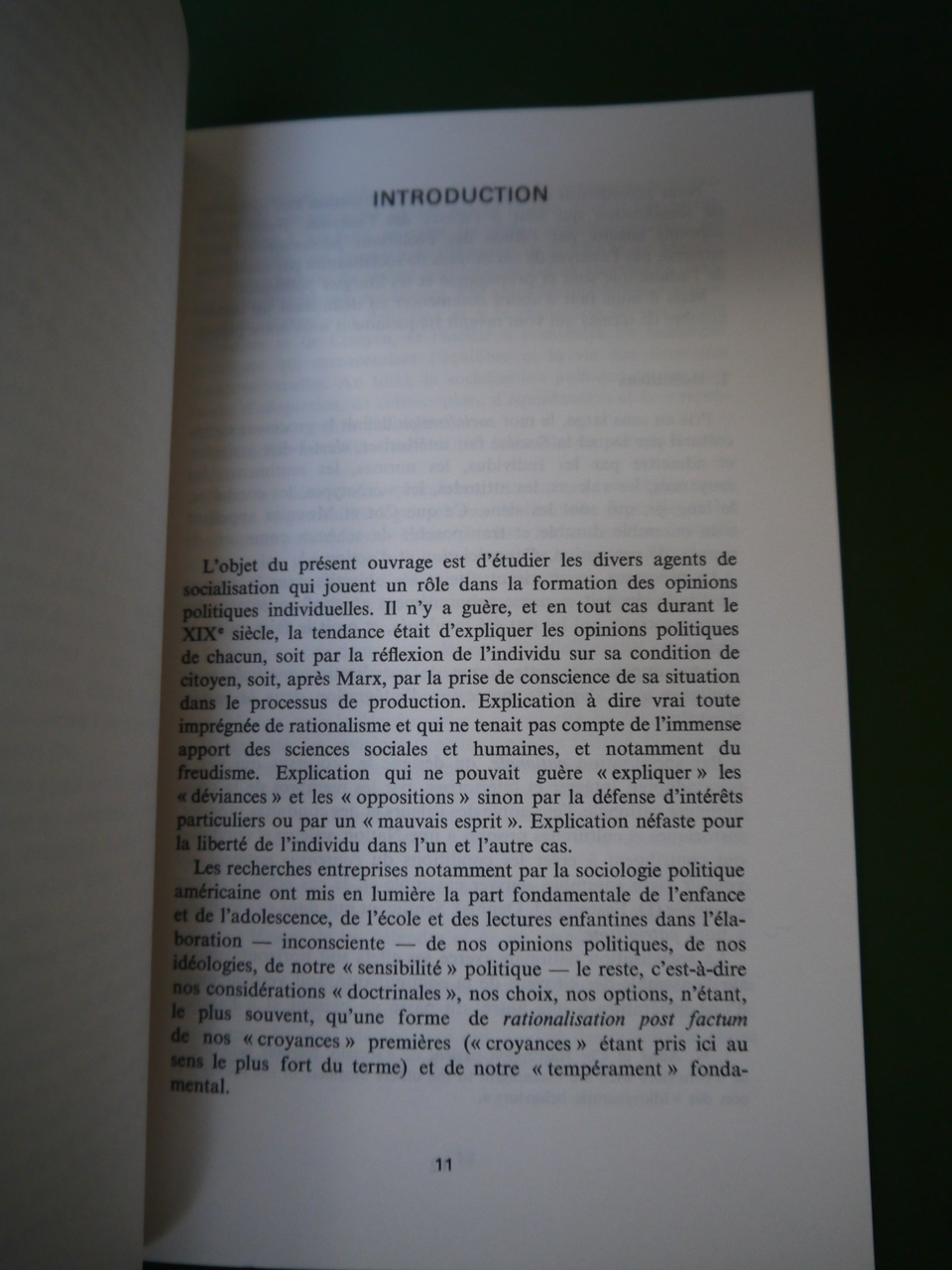 Sous-titre: « Société – Etat – Parti ». « L’objet du présent ouvrage est d’étudier les divers agents de socialisation qui jouent un rôle dans la formation des opinions politiques individuelles. »