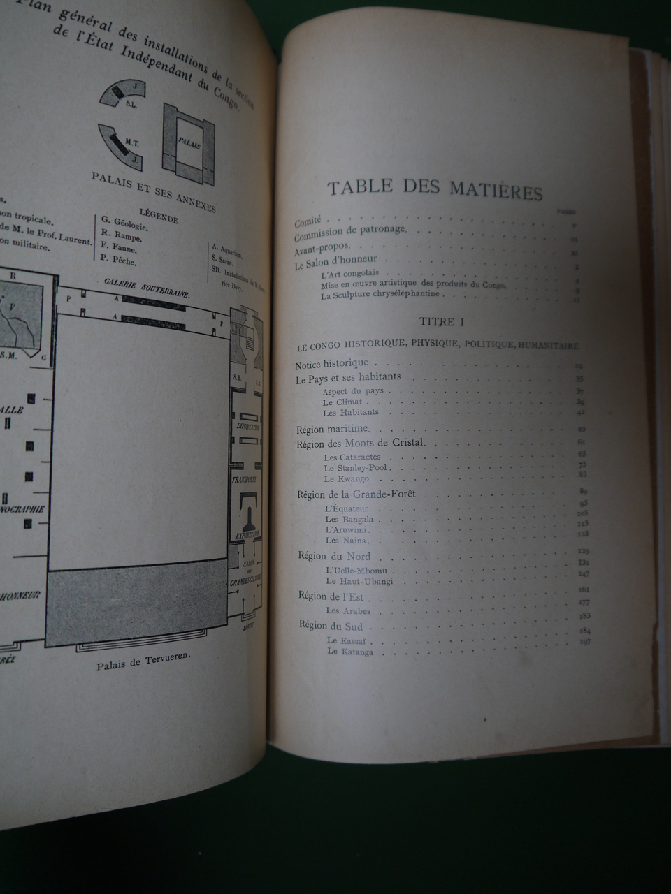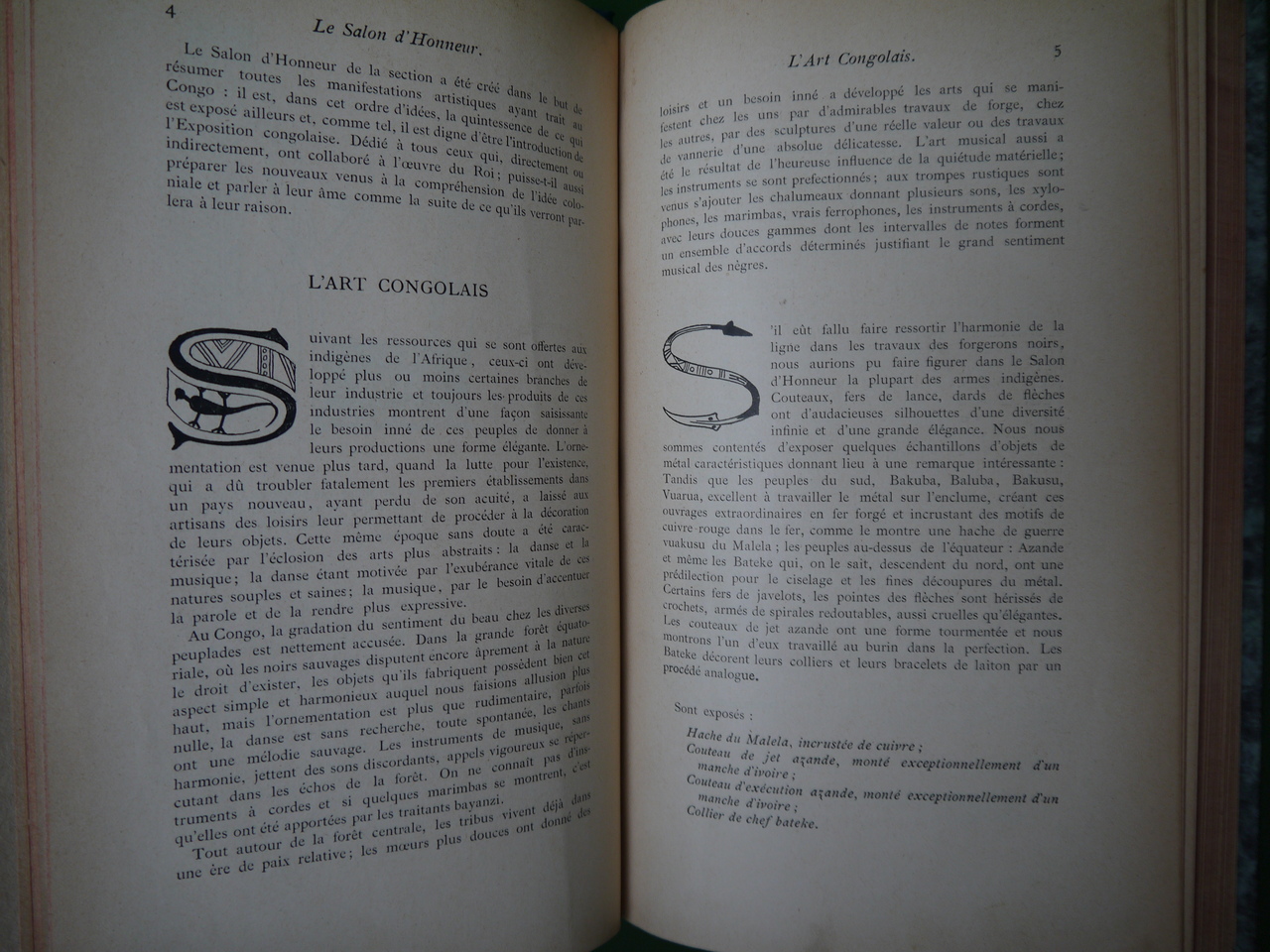 On lit dans l’avant-propos: « L’autre subdivision du Comité exécutif, la « Section du Congo », s’est occupée de l’installation des différents villages indigènes: enfants de Gyseghem, Bangala, Mayombe et du détachement de la Force publique. » Quelques pages sur l’art congolais et la sculpture chryséléphantine ouvrent cet ouvrage de plus de 500 pages.