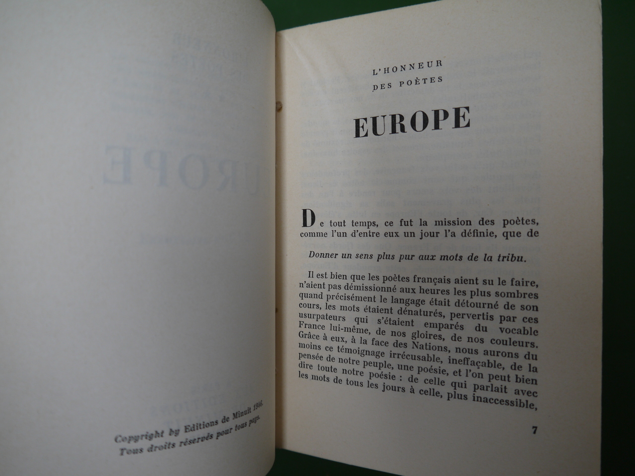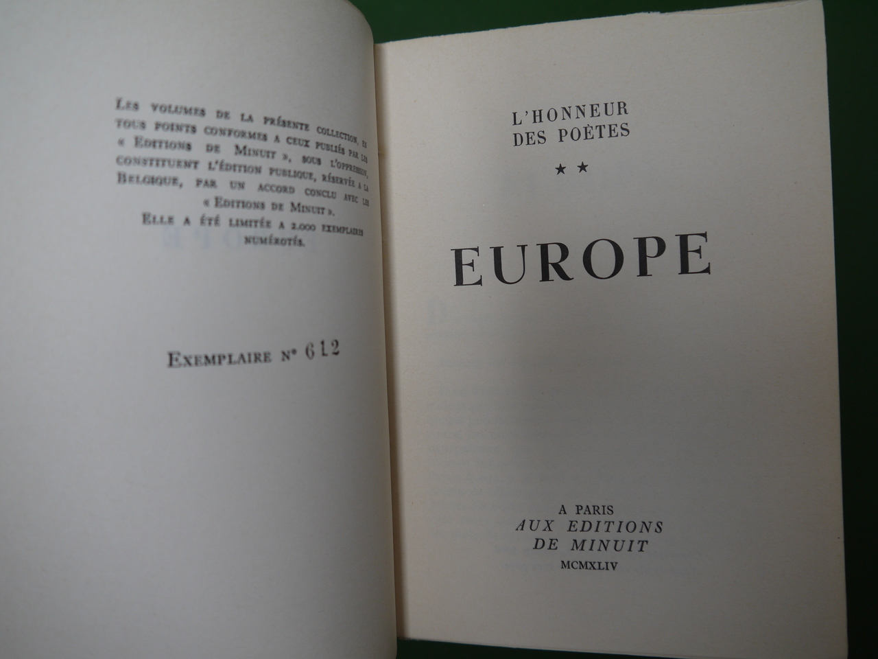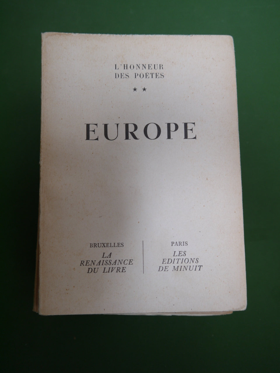 Un des 2000 exemplaires de l’édition belge des ouvrages publiés par Minuit « sous l’oppression ». Le second tome s’intitule « Europe ». Parmi les contributeurs, sous pseudonymes évidemment: Eluard, Francis Ponge, Vercors, Pierre Emmanuel, Aragon…