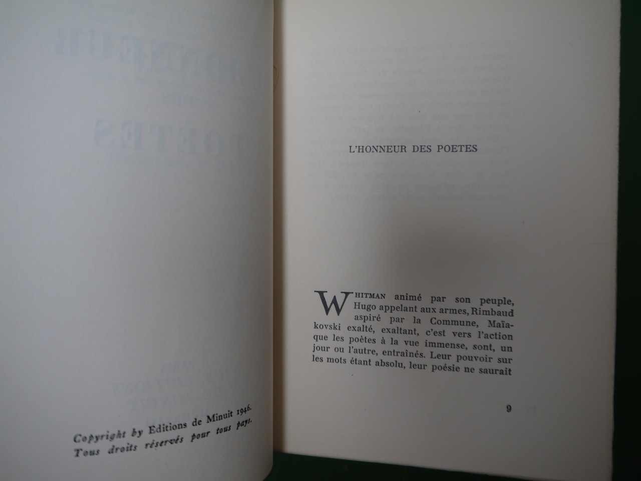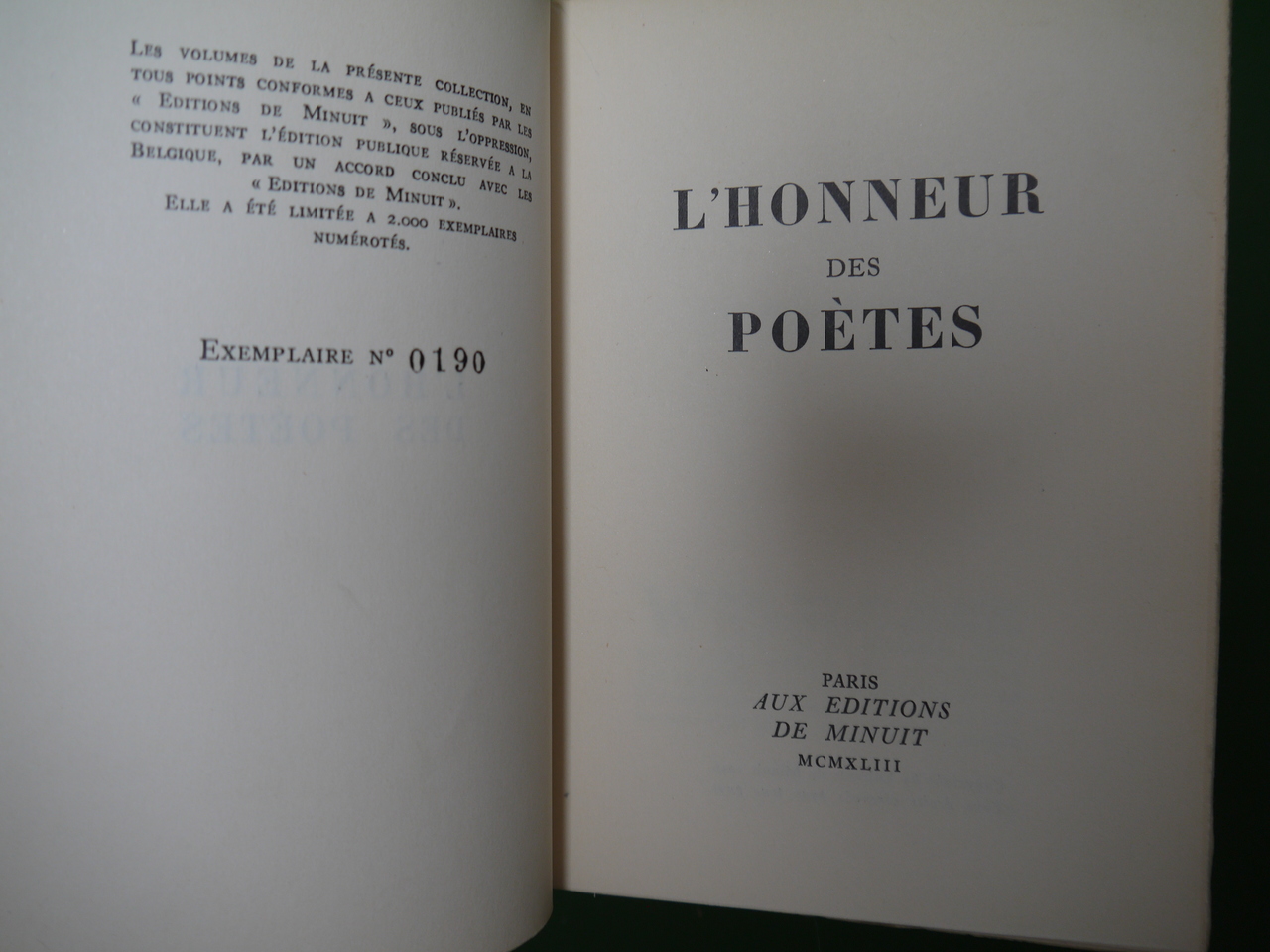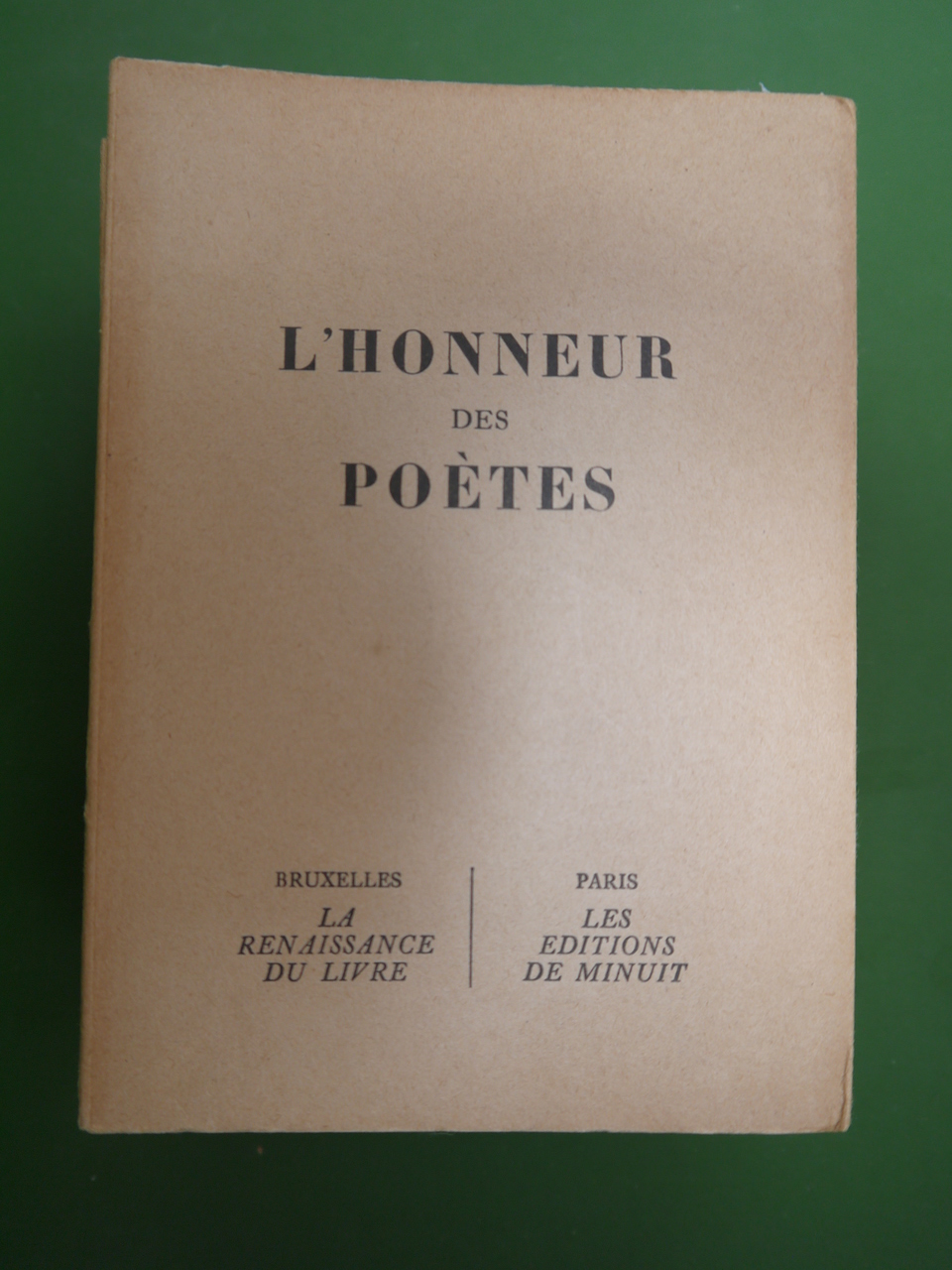 Un des 2000 exemplaires de l’édition belge des ouvrages publiés par Minuit « sous l’oppression ». Le second tome s’intitule « Europe ». Parmi les contributeurs, sous pseudonymes évidemment: Eluard, Francis Ponge, Vercors, Pierre Emmanuel, Aragon…