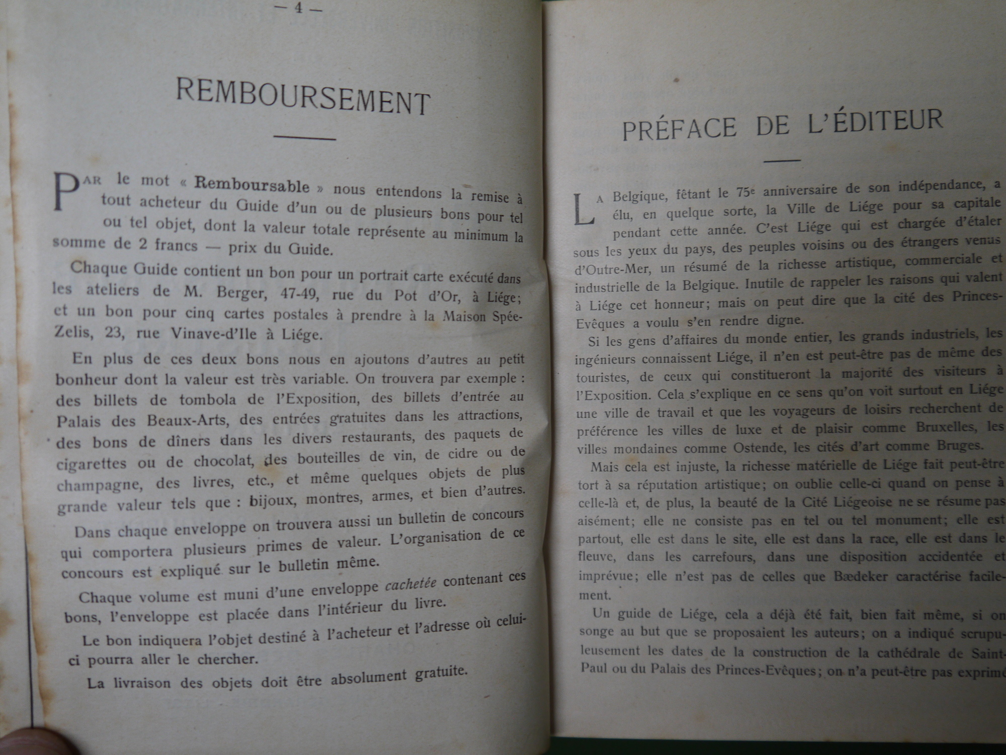 Guide de l’exposition universelle et internationale de liège 1905, un exemplaire parmi les 25.000 de la 2ème édition. La partie littéraire est due à Mr L. Souguenet. Avec 2 cartes dépliantes.