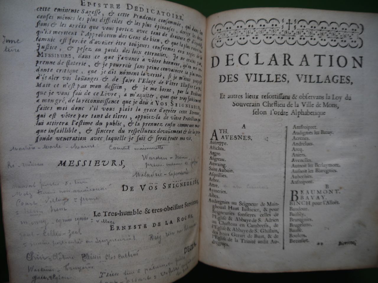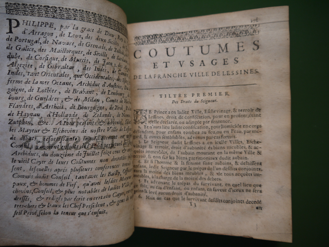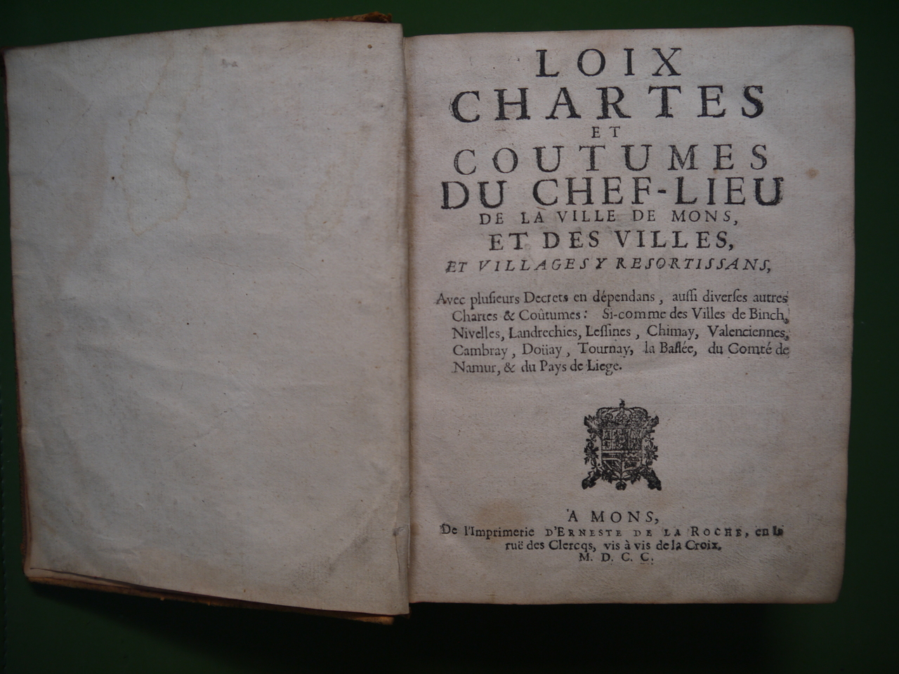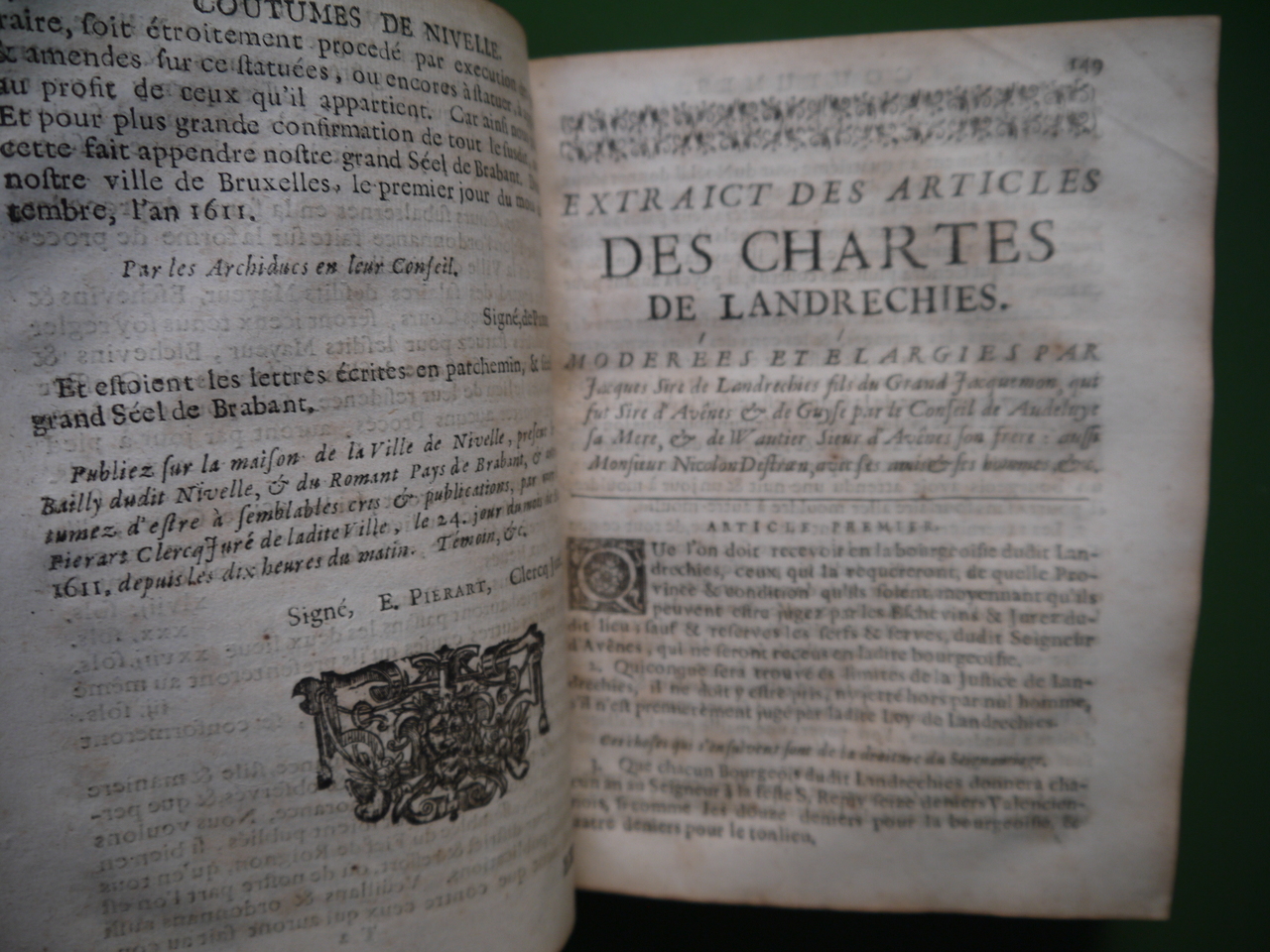 « Avec plusieurs décrets en dépendans, aussi diverses autres chartes & coutumes: si-comme des villes de Binch, Nivelles, Landrechies, Lessines, Chimay, Valenciennes, Cambray, Doüay, Tournay, la Bassée, du comté de Namur & du pays de Liège ».