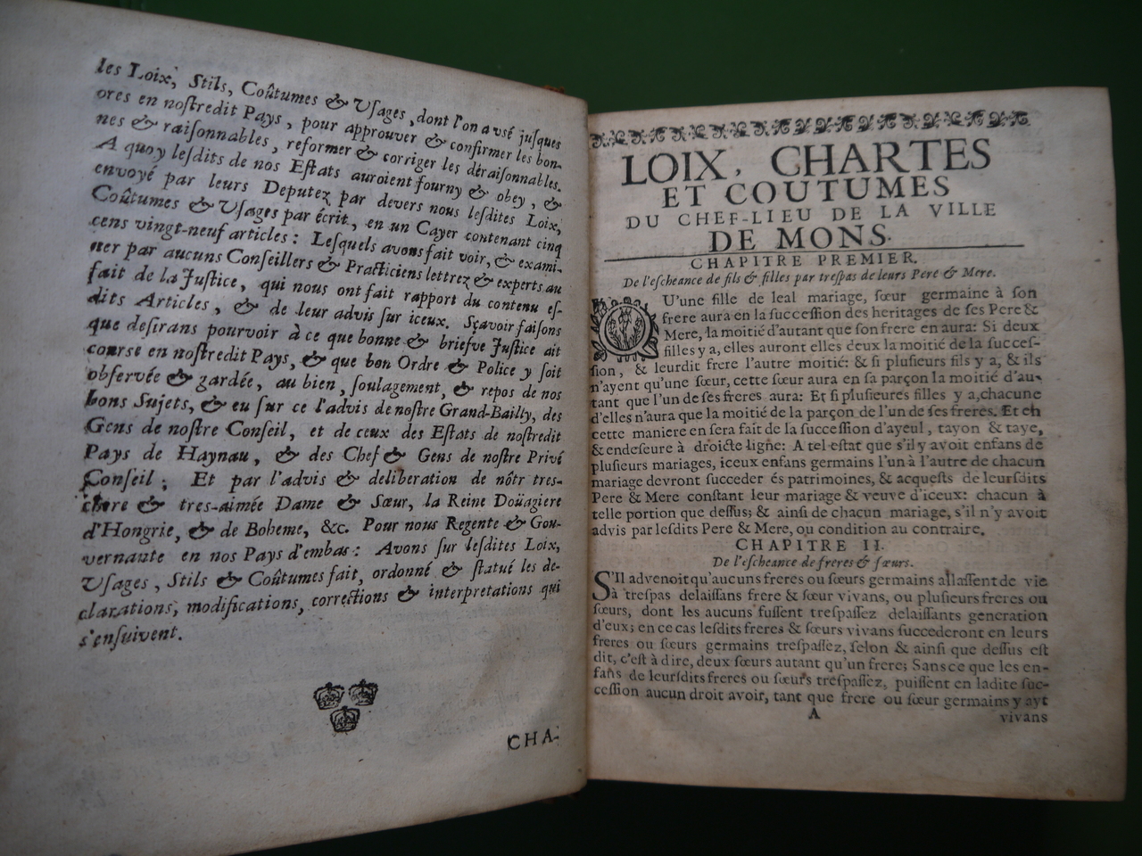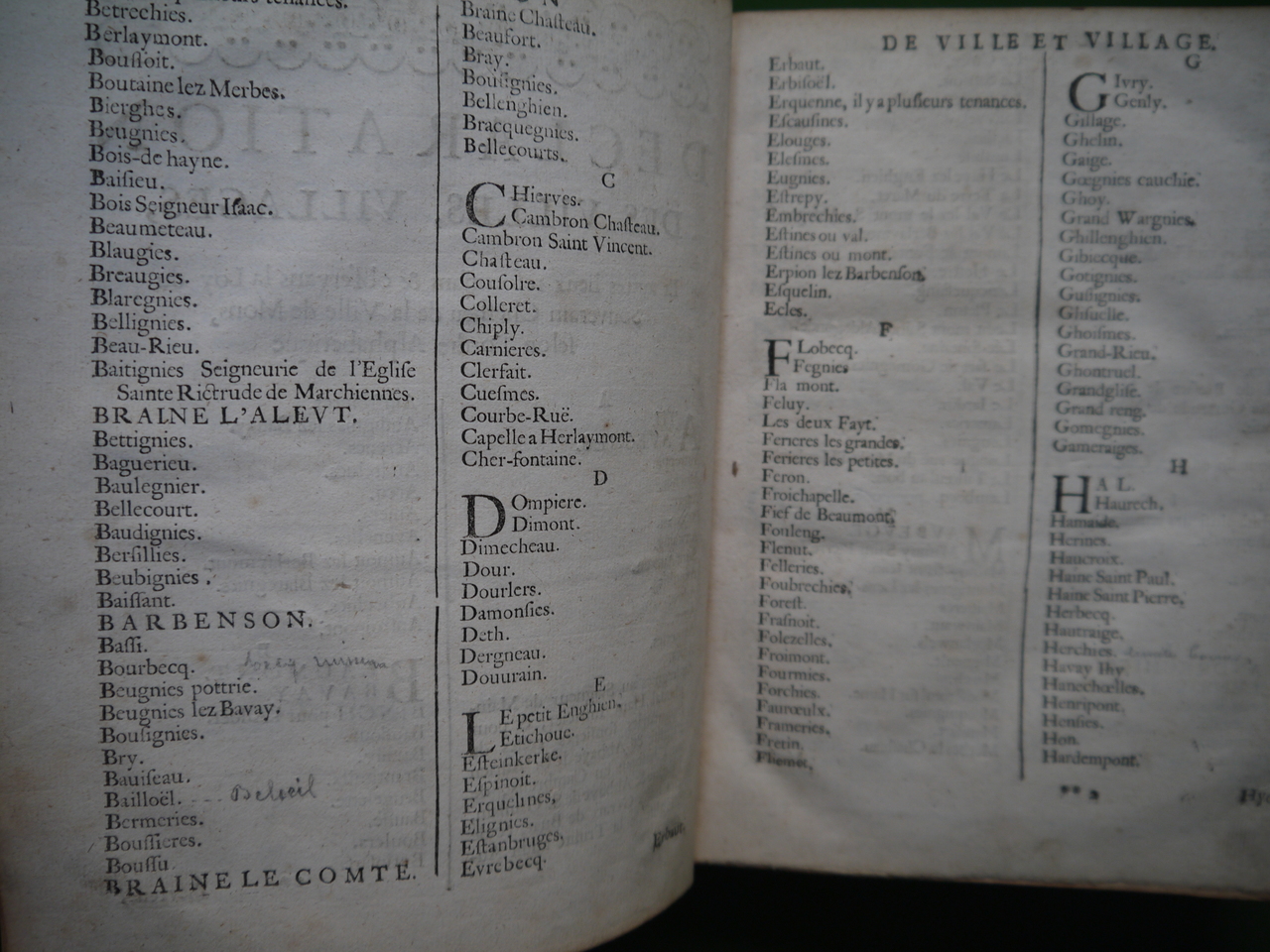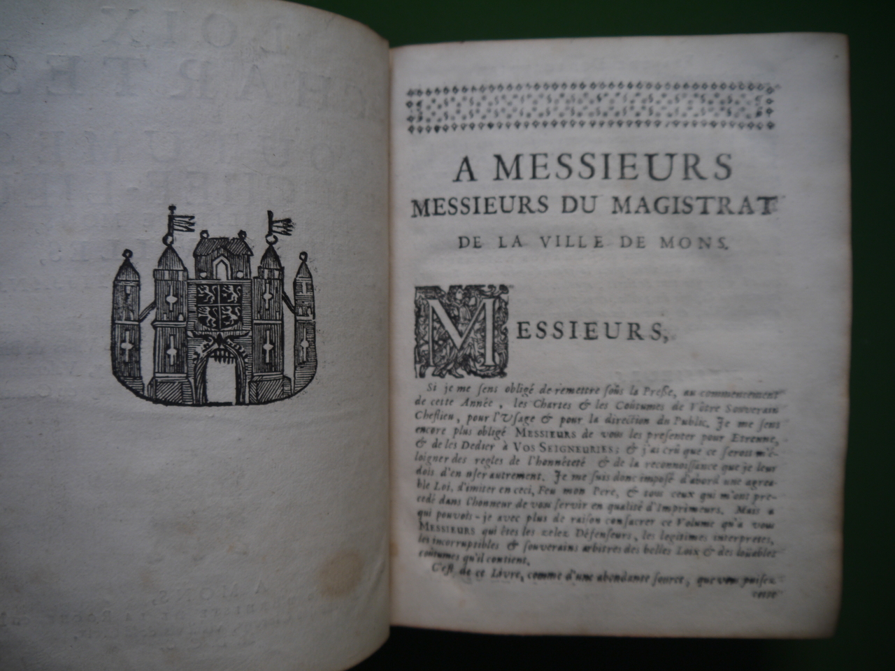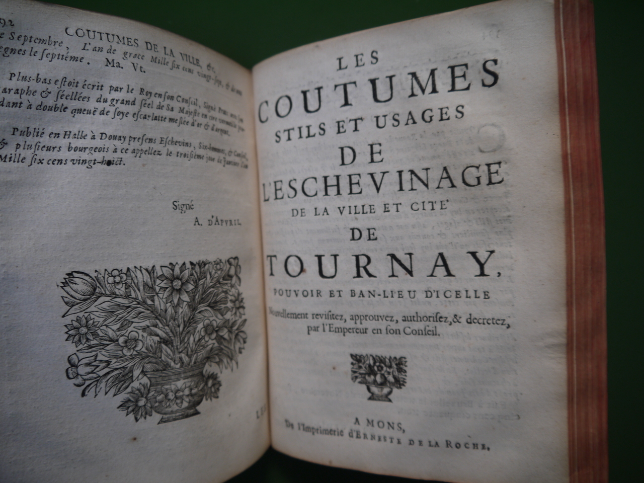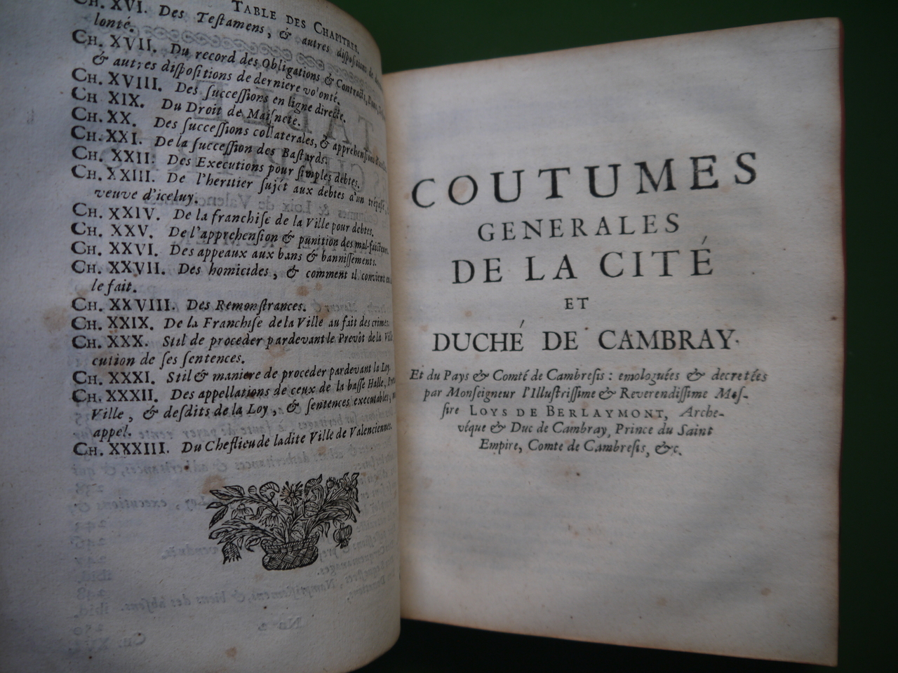 « Avec plusieurs décrets en dépendans, aussi diverses autres chartes & coutumes: si-comme des villes de Binch, Nivelles, Landrechies, Lessines, Chimay, Valenciennes, Cambray, Doüay, Tournay, la Bassée, du comté de Namur & du pays de Liège ».