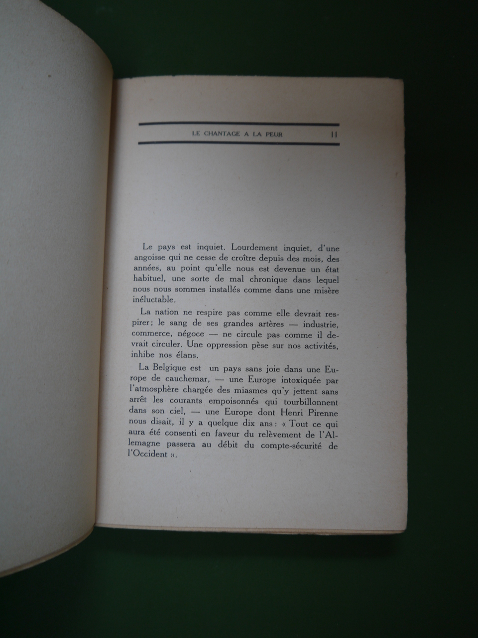 Texte suivi de « L’angoisse de la Suisse ». « Hitler a demandé à la Belgique: « Vous sentez-vous menacée par l’Allemagne? » Sous peine de manquer à la prudence, le gouvernement a répondu « NON ». Sous peine de manquer à la vérité, huit millions de belges répondent « OUI ». Le pays est inquiet. Lourdement inquiet. »