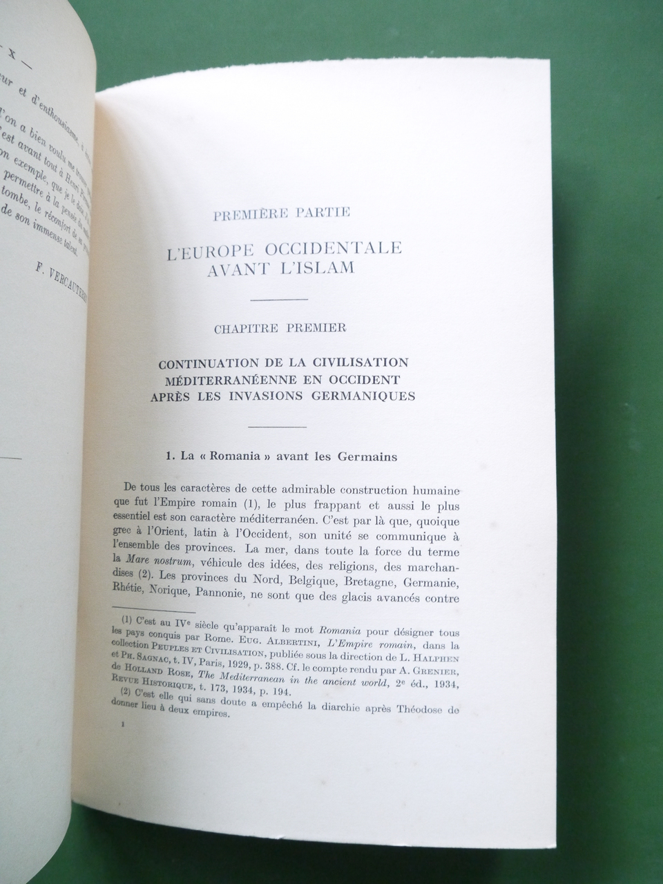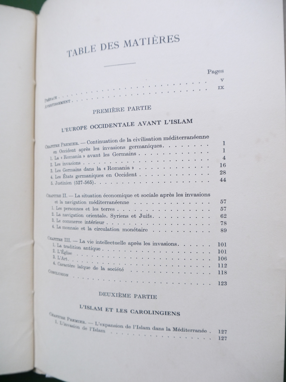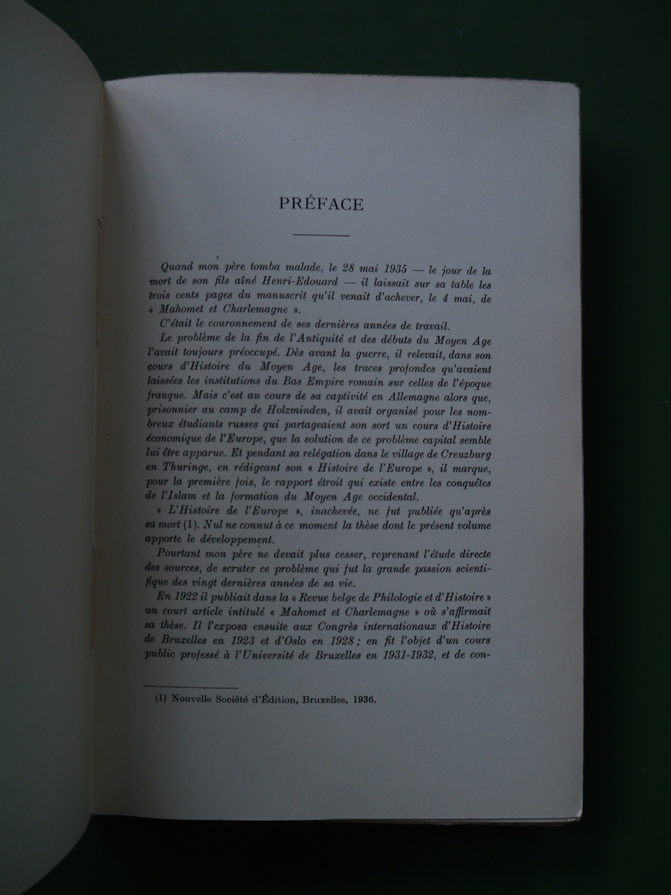 Neuvième édition, parue deux ans après la mort du plus célèbre historien belge. Un premier texte de 1922, ébauche de ce livre, se terminait ainsi: « Sans l’islam, l’Empire franc n’aurait sans doute jamais existé, et Charlemagne sans Mahomet serait inconcevable ».
