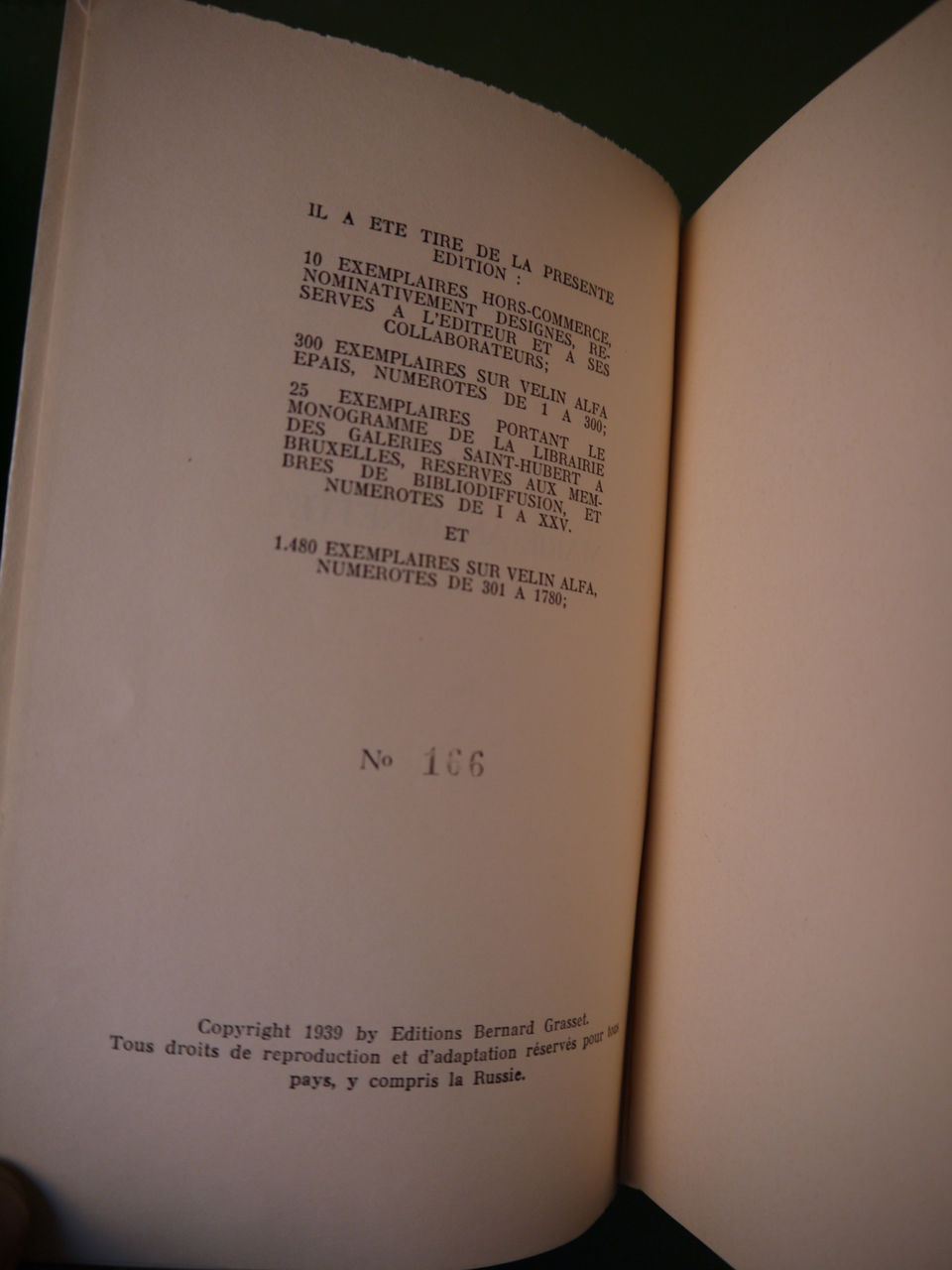 Aucune adresse n’est mentionnée pour cet éditeur actif à Bruxelles avant et après-guerre… Un texte emprunté au catalogue Grasset. Un des 300 exemplaires sur vélin alfa.