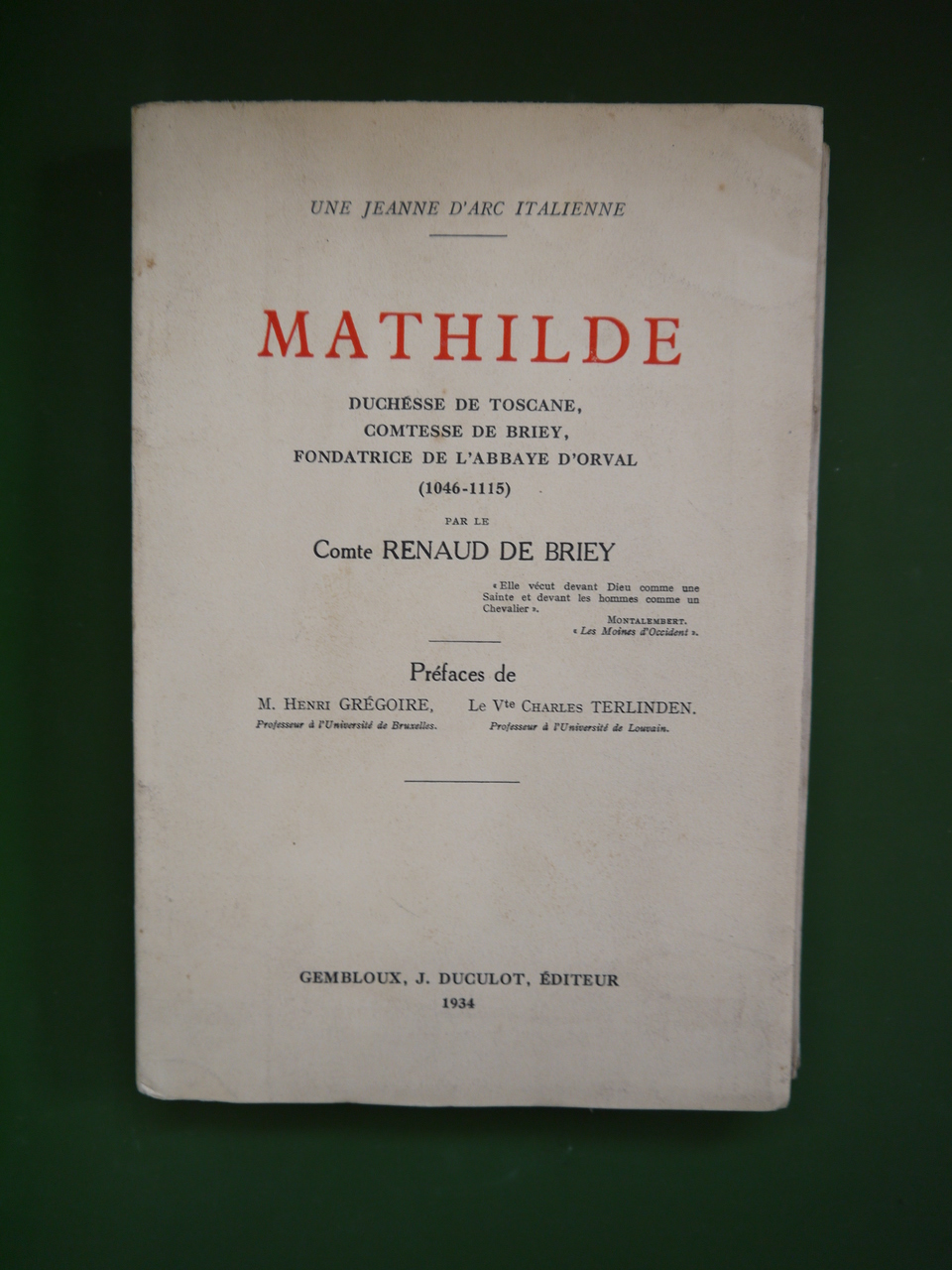 « Mathilde, duchesse de Toscane, comtesse de Briey, fondatrice de l’abbaye d’Orval (1046-1115) ». « Une Jeanne d’Arc italienne » précise l’auteur… dont une rapide biographie est disponible ici.