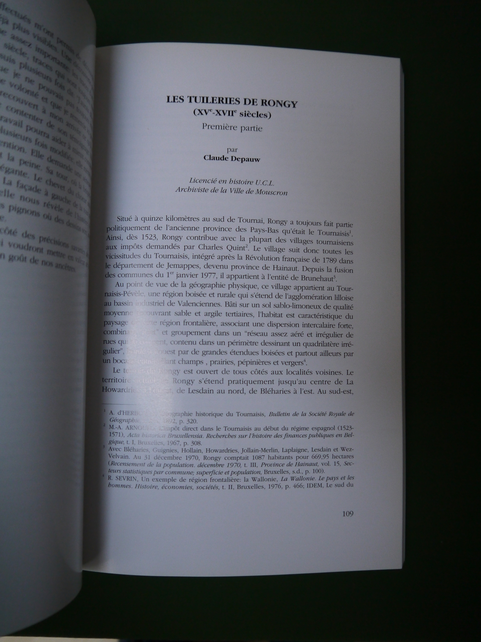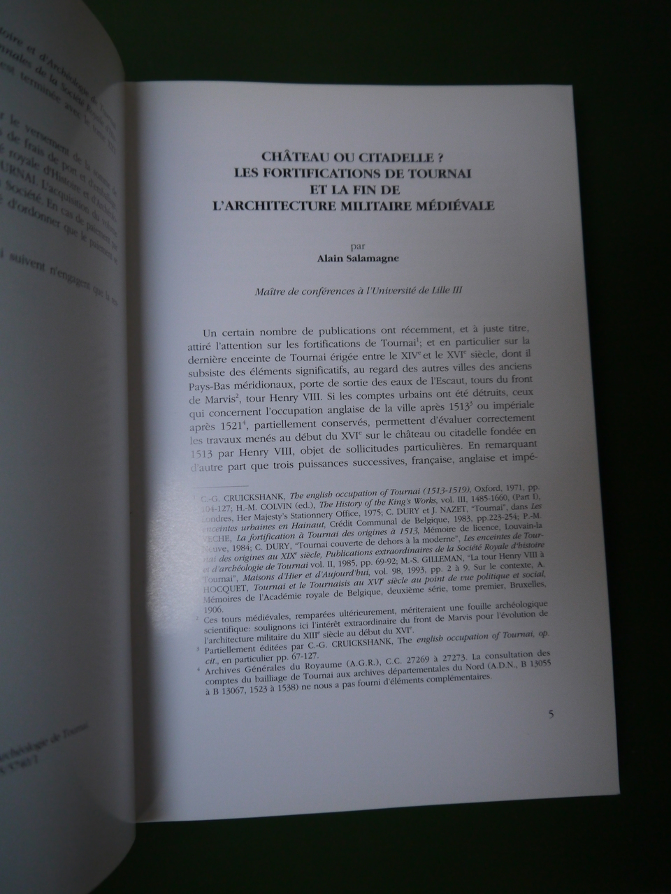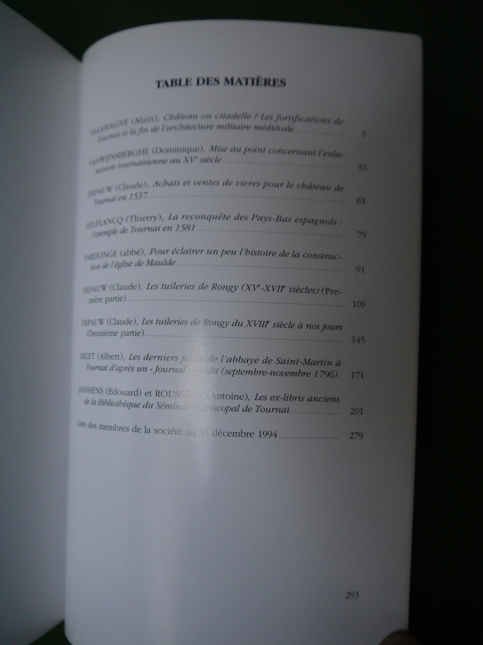 Avec 8 contributions: DELPLANCQ (Thierry) — La reconquête des Pays-Bas espagnols : l’exemple de Tournai en 1581, DEPAUW (Claude) — Achats et ventes de vivres pour le château de Tournai en 1581, DEPAUW (Claude) — Les tuileries de Rongy (XVe-XVIIe siècles) (première partie), DEPAUW (Claude) — Les tuileries de Rongy du XVIIIe siècle à nos jours. (deuxième partie), JANSSENS (Edouard) et ROUSSEAU (Antoine) — Les ex-libris anciens de la Bibliothèque du Séminaire épiscopal de Tournai, MILET (Albert) — Les derniers jours de l’abbaye de Saint-Martin à Tournai d’après un «Journal» inédit (septembre-novembre 1796), PARDONGE (abbé J.) — Pour éclairer un peu l’histoire de la construction de l’église de Maulde, SALAMAGNE (Alain) — Château ou citadelle ? Les fortifications de Tournai et la fin de l’architecture militaire médiévale, VAN WIJNSBERGHE (Dominique) — Mise au point concernant l’enluminure tournaisienne au XVe siècle.