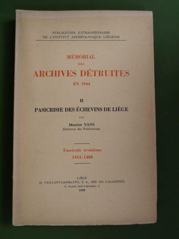 Soyez le premier à laisser votre avis sur “Mémorial des archives détruites en 1944 II, Pasicrisie des échevins de Liège, Maurice Yans, H. Vaillant-Carmanne, 1950”