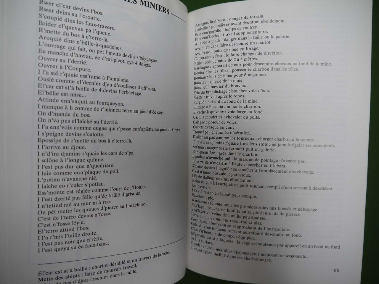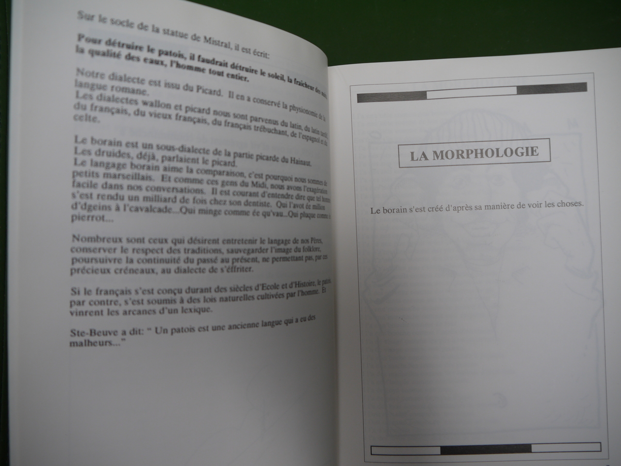 Du patois borain en l’occurrence; on trouve même un dictionnaire en fin d’ouvrage… L’auteur a aussi écrit de nombreuses chansons en borain.
