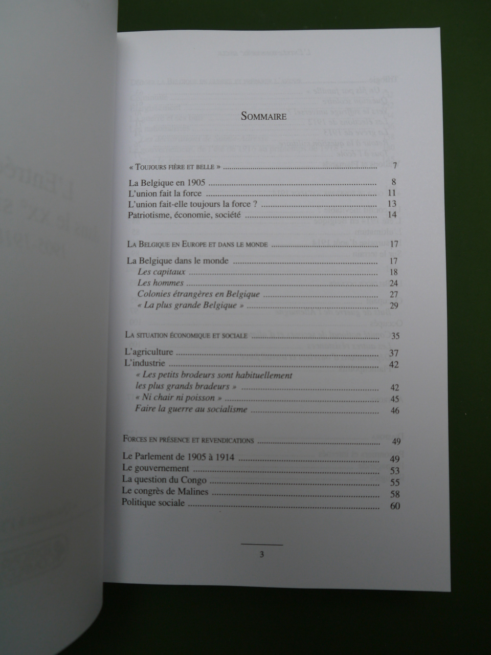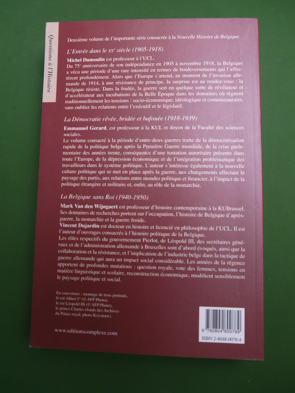 Les divers auteurs sont M. Dumoulin (« L’entrée dans le XXe siècle 1905-1918 »), E. Gérard (« La démocratie rêvée, bridée et bafouée 1918-1939 ») et M. van den Wijngaert et V. Dujardin (« La Belgique sans roi 1940-1950 »).