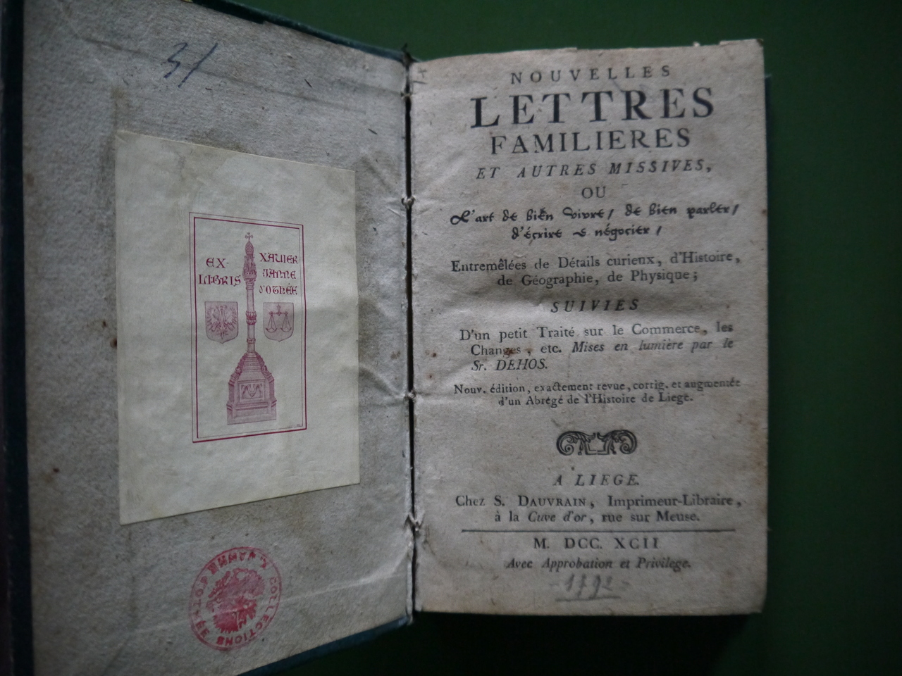 Le titre se poursuit comme suit: « Ou l’art de bien vivre / de bien parler / d’écrire et négocier / entremêlées de détails curieux d’Histoire, de Géographie, de Physique; suivies d’un petit traité sur le commerce, les changes, etc – mises en lumière par le Sr. Dehos. Nouv. édition, exactement revue, gorrig. et augmentée d’un abgrégé de l’Histoire de Liège ».
