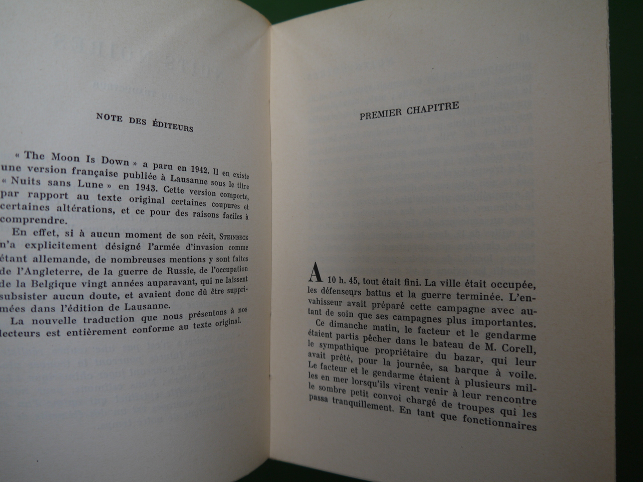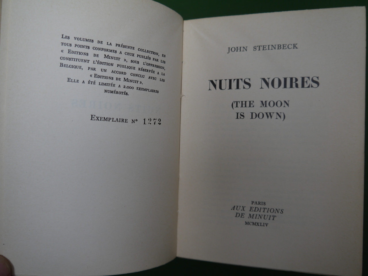 Un des 2000 exemplaires de l’édition belge des ouvrages publiés par Minuit “sous l’oppression”… Titre original: « The moon is down ».