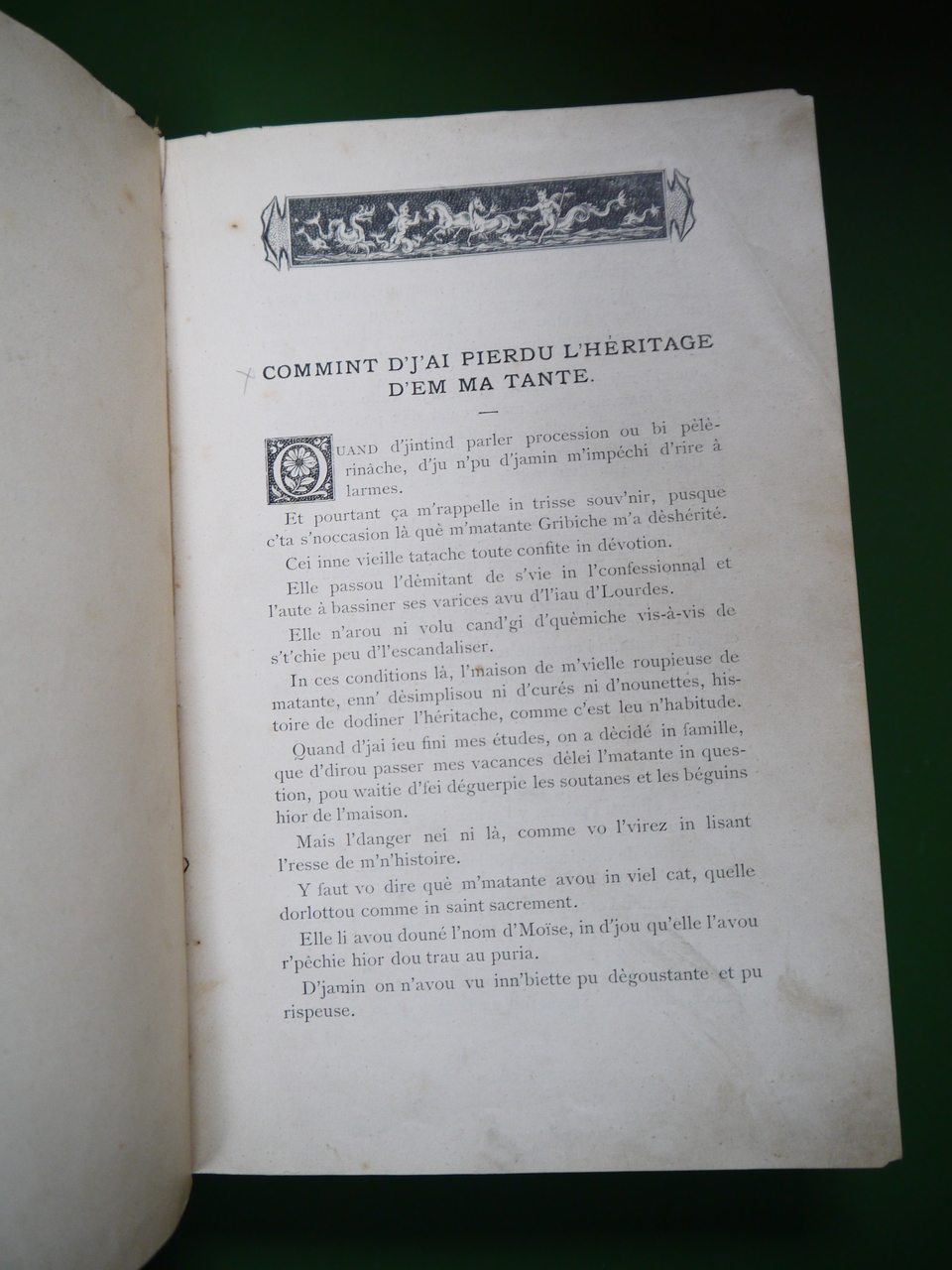 En véritable patois borain made in Frameries! Edition probable en 1892, ouvrage divisé en six parties: Prose, fauques, cansons, monolôques, poésies diverses, théâte. L’exemplaire proposé, bien que relié, a bien vécu déjà, à noter notamment quelques crayonnages et rousseurs.