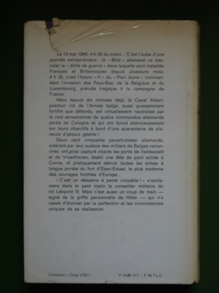 Retour sur la neutralisation-éclair d’Eben-Emael et des autres forts de la région liégeoise à l’aube du 10 mai 1940. La jaquette de l’exemplaire en vente est manquante.