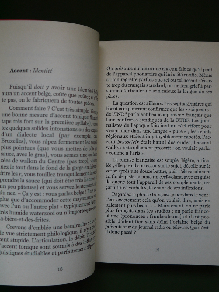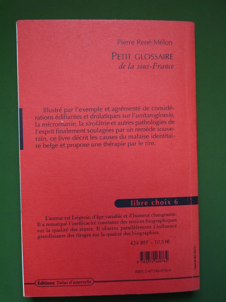On s’en serait douté, l’auteur est un « rattachiste » du RWF. Mais c’est surtout un joyeux drille se décrivant par exemple comme suit: « La naissance de Pierre René Mélon est marquée par trois catastrophes qui détermineront le reste de sa vie : il n’a pu choisir ni son lieu de naissance, ni son nom, ni sa langue maternelle. De là une inclination aux voyages et un goût anormal pour l’anonymat et les langues étrangères. Né pendant la Guerre froide aux confins de la Gaule septentrionale et de la Germanie inférieure, il apprend à lire et à écrire avec des maîtres locaux. A peine sorti de l’adolescence, il s’en va tâter longuement aux rondeurs et aspérités du monde, fréquentant druides, sages et fols. Tant et si bien qu’à l’âge où les contribuables normaux ont déjà construit leur première maison de brique, il entreprend sérieusement de s’instruire. Il s’assied donc longuement dans les salles chauffées de l’université de Leodiensis. »