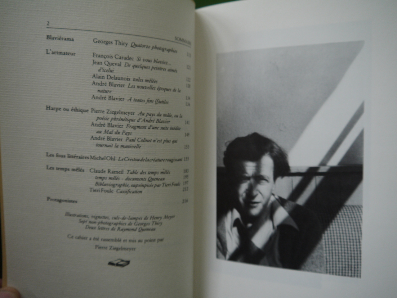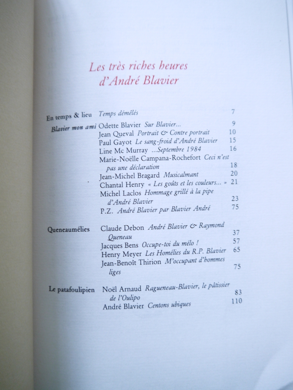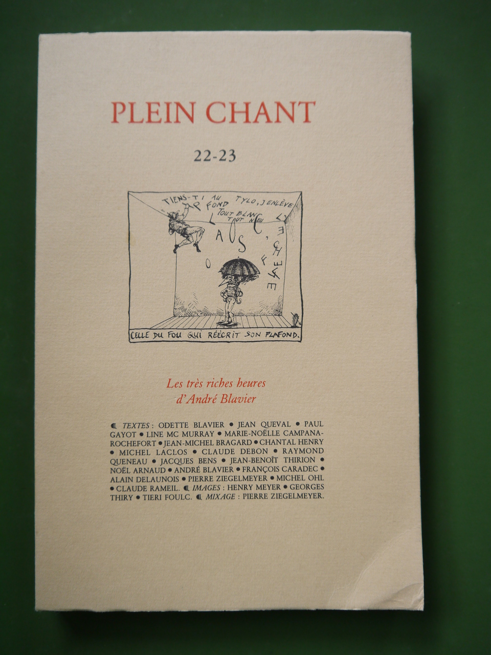 Un numéro de la revue littéraire sous-titré « Les très riches heures d’André Blavier ».  Avec la participation de Noël Arnaud, Jacques Bens, Odette Blavier, Jean-Michel Bragard,  Marie-Noëlle Campana-Rochefort, François Caradec, Claude Debon, Alain Delaunois, Paul Gayot, Chantal Henry, Michel Laclos, Line Mc Murray, Michel Ohl, Jean Queval, Claude Rameil, Jean-Benoît Thirion, Pierre Ziegelmeyer. Illustrations de Henry Meyer, oupeinpisations de Thieri Foulc, photographies de Georges Thiry. Textes rares et inédits d’André Blavier. Bibliographie. Table de temps mêlés, 1952-1984.