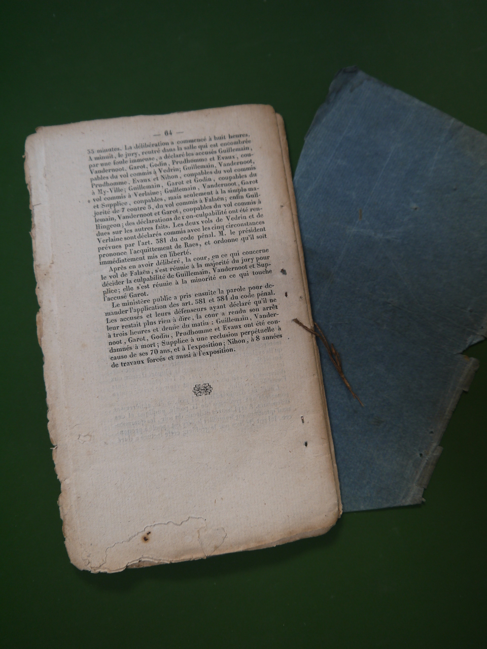 Compte-rendu de plusieurs audiences de tribunal, le procès en question étant relatif à des vols qualifiés dans les provinces de Namur et de Liège, semble-t-il – et se clôturant sur quelques condamnations à mort! 64 pages.