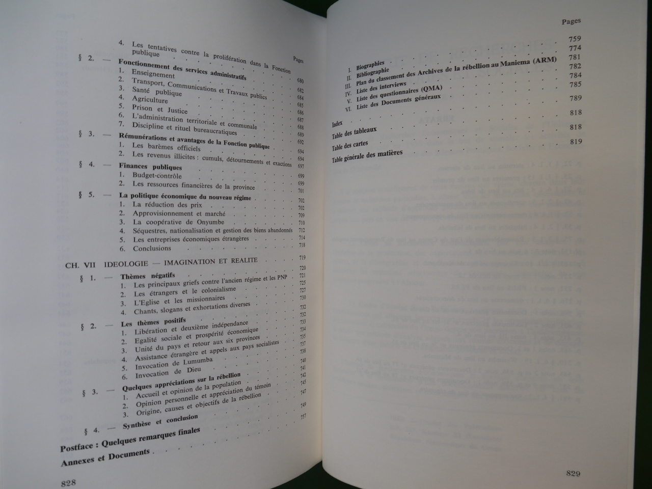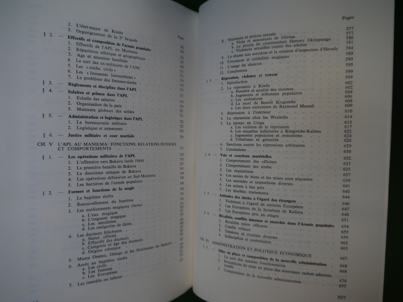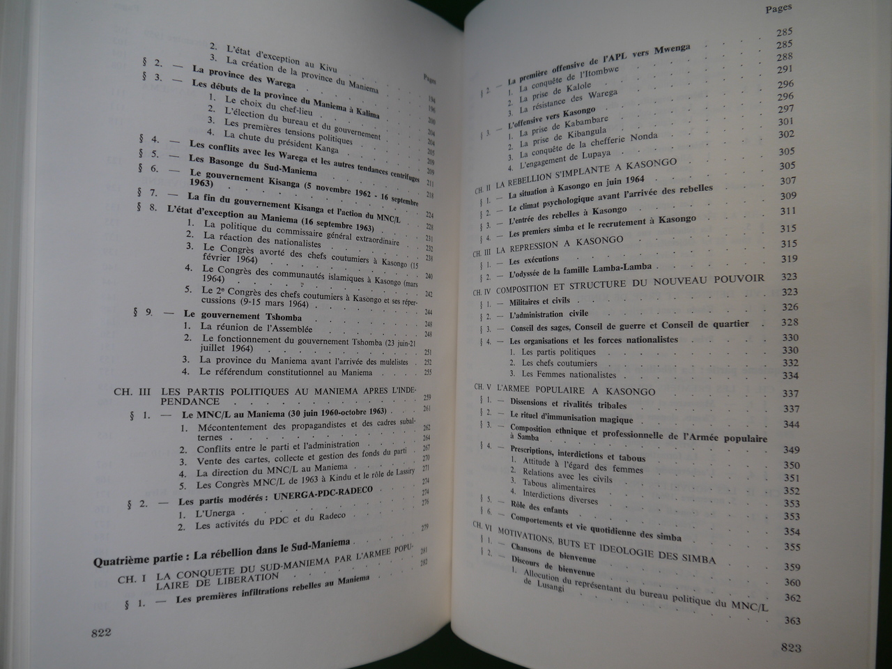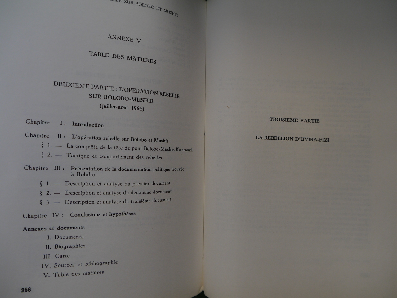 Le tome 1 est co-édité par l’INEP, l’Institut national d’études politiques, à Léopoldville. Le tome 1 aborde « l’opération rebelle sur Bolobo et Mushie », « la rébellion d’Uvira-Fizi » et « la rébellion au Nord-Katanga ». Le tome 2 est sous-titré « Maniema ». L’ensemble totalise près de 1400 pages! Biographie de l’auteur ici.