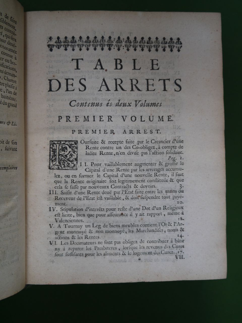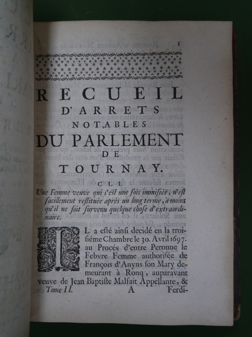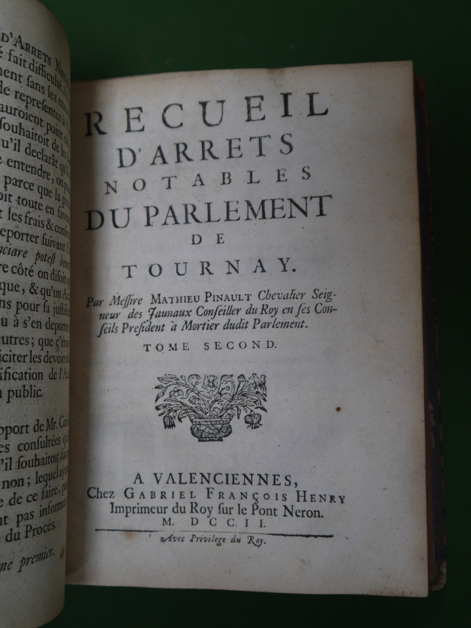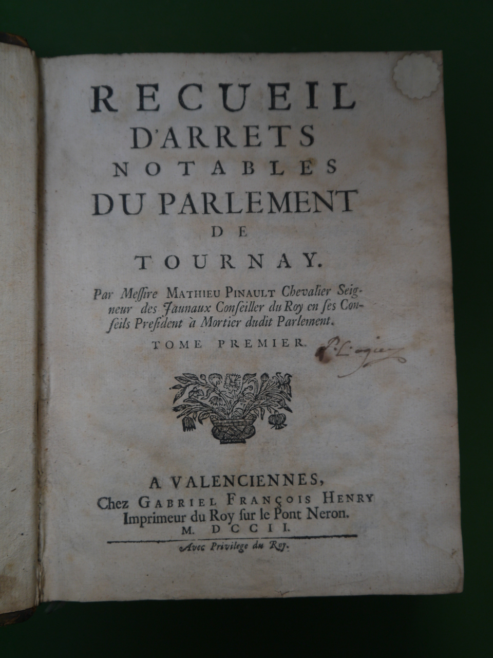 Deux tomes réunis en 1 volume. L’auteur était « Messire Mathieu Pinault, Chevalier, seigneur des Jaunaux, conseiller du Roy en ses conseils président à Mortier dudit Parlement ». Deux autres tomes existent, parus en 1715. Au menu des tomes 1 et 2, 300 arrêts, parmi lesquels: « Un curé qui fait bâtir sur le fonds de la cure de son propre mouvement, est présumé le vouloir faire à ses frais et pour son plaisir », « A Tournay un leg de biens meubles contient l’or et l’argent monnoyé et non monnoyé, les marchandises, noms et actions, et les rentes » ou encore « Les portions des dixmes cédées par les décimateurs aux curez en suplément et augmentation des portion congruë, passent aux curez avec leurs charges ordinaires ».