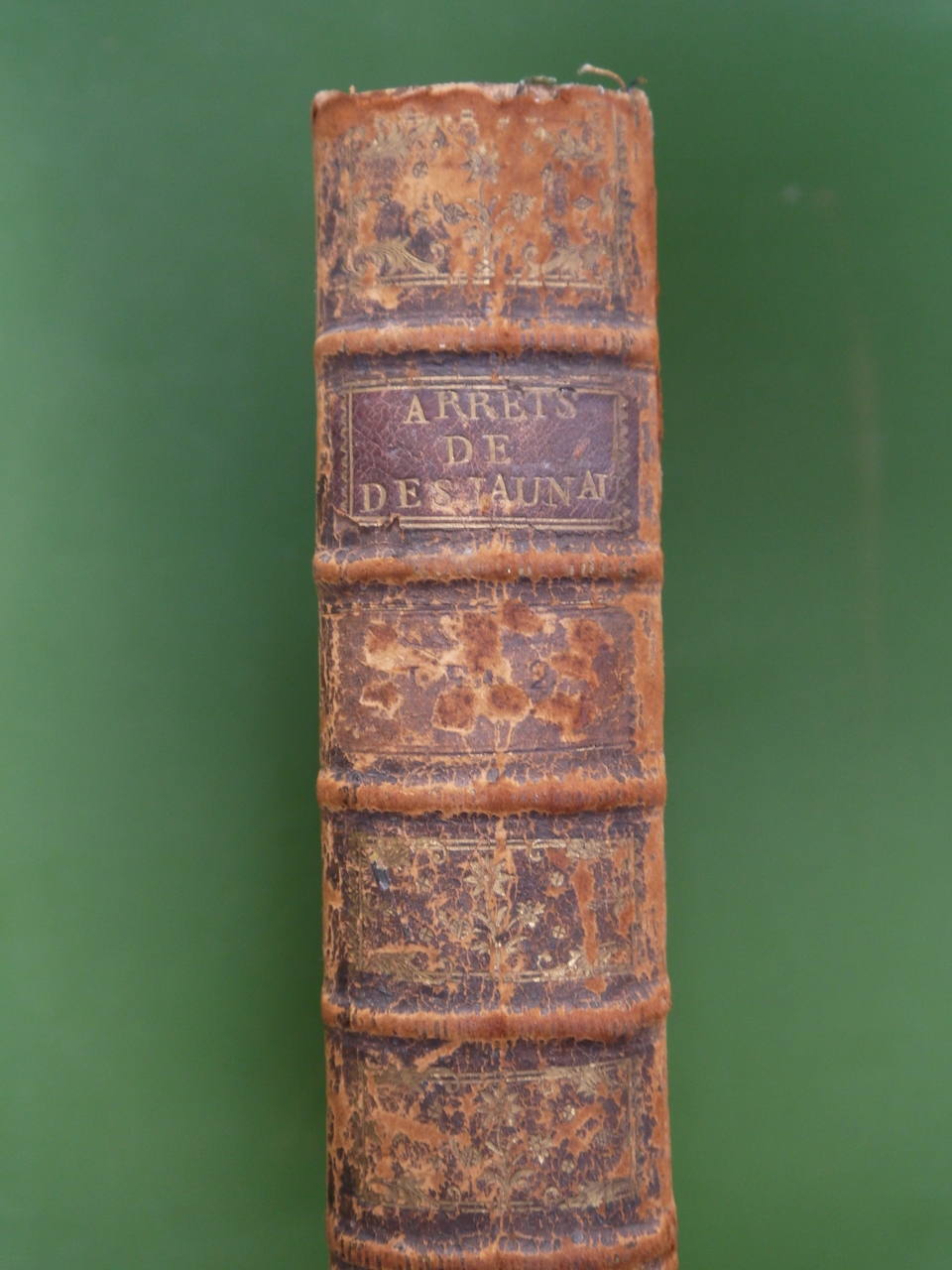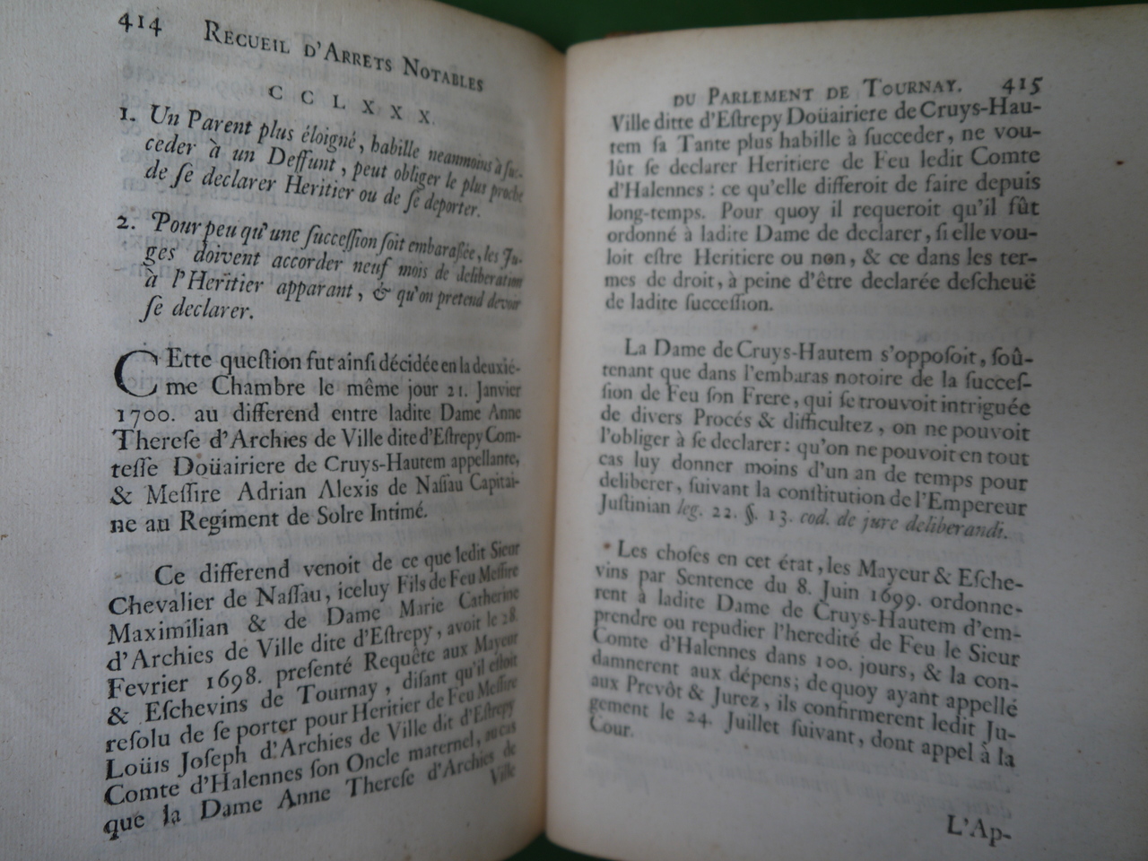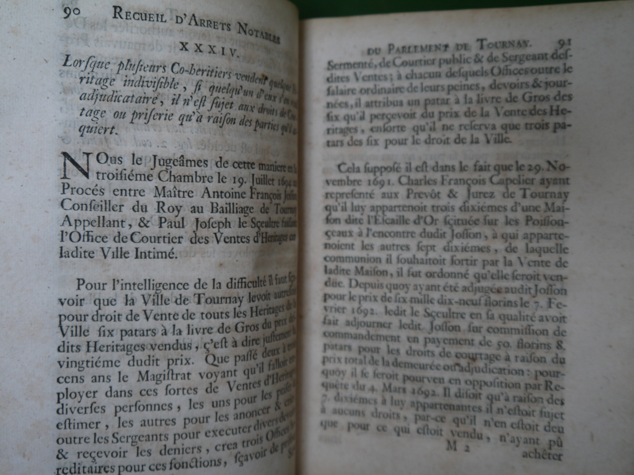 Deux tomes réunis en 1 volume. L’auteur était « Messire Mathieu Pinault, Chevalier, seigneur des Jaunaux, conseiller du Roy en ses conseils président à Mortier dudit Parlement ». Deux autres tomes existent, parus en 1715. Au menu des tomes 1 et 2, 300 arrêts, parmi lesquels: « Un curé qui fait bâtir sur le fonds de la cure de son propre mouvement, est présumé le vouloir faire à ses frais et pour son plaisir », « A Tournay un leg de biens meubles contient l’or et l’argent monnoyé et non monnoyé, les marchandises, noms et actions, et les rentes » ou encore « Les portions des dixmes cédées par les décimateurs aux curez en suplément et augmentation des portion congruë, passent aux curez avec leurs charges ordinaires ».