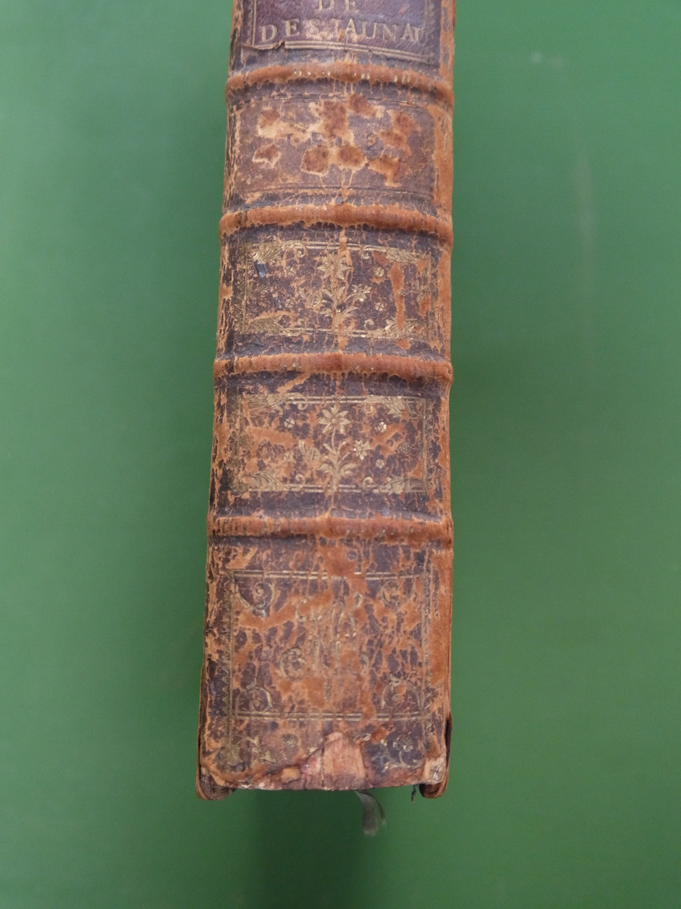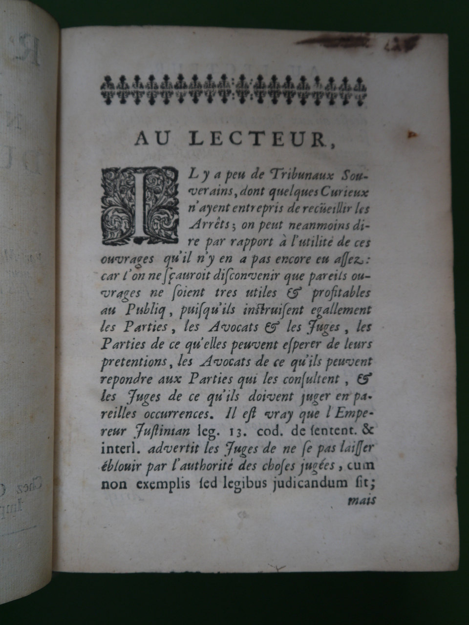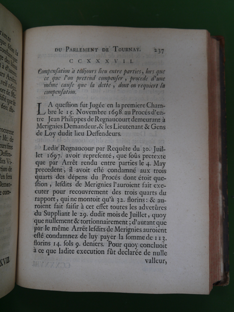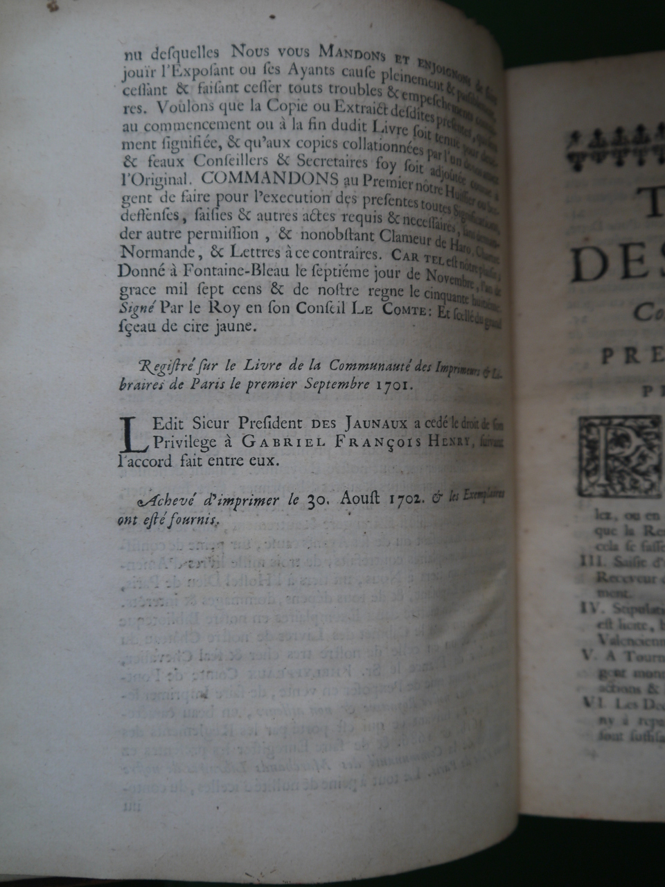 Deux tomes réunis en 1 volume. L’auteur était « Messire Mathieu Pinault, Chevalier, seigneur des Jaunaux, conseiller du Roy en ses conseils président à Mortier dudit Parlement ». Deux autres tomes existent, parus en 1715. Au menu des tomes 1 et 2, 300 arrêts, parmi lesquels: « Un curé qui fait bâtir sur le fonds de la cure de son propre mouvement, est présumé le vouloir faire à ses frais et pour son plaisir », « A Tournay un leg de biens meubles contient l’or et l’argent monnoyé et non monnoyé, les marchandises, noms et actions, et les rentes » ou encore « Les portions des dixmes cédées par les décimateurs aux curez en suplément et augmentation des portion congruë, passent aux curez avec leurs charges ordinaires ».
