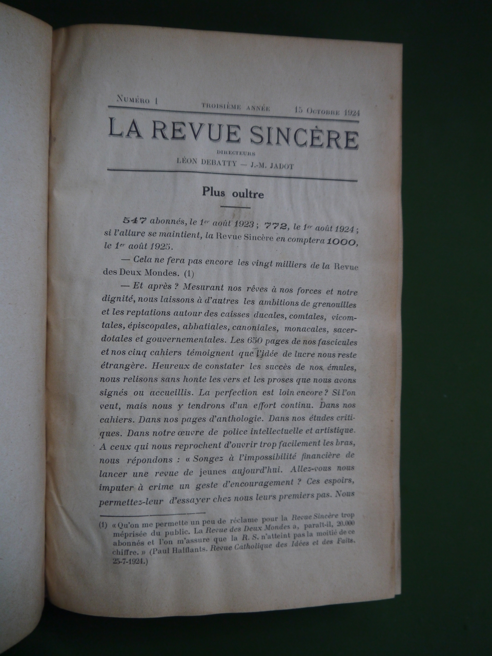 Recueil de 9 numéros de la Revue sincère, fondée par le critique Léon Debatty, viré du XXe siècle suite à ses attaques envers des auteurs coupables de plagiat comme Henry Carton de Wiart. Le numéro 4 de la 3e année se fait l’écho du « manifeste du surréalisme » de Breton.  Le numéro 7 de la 11e année (1933) est joint.